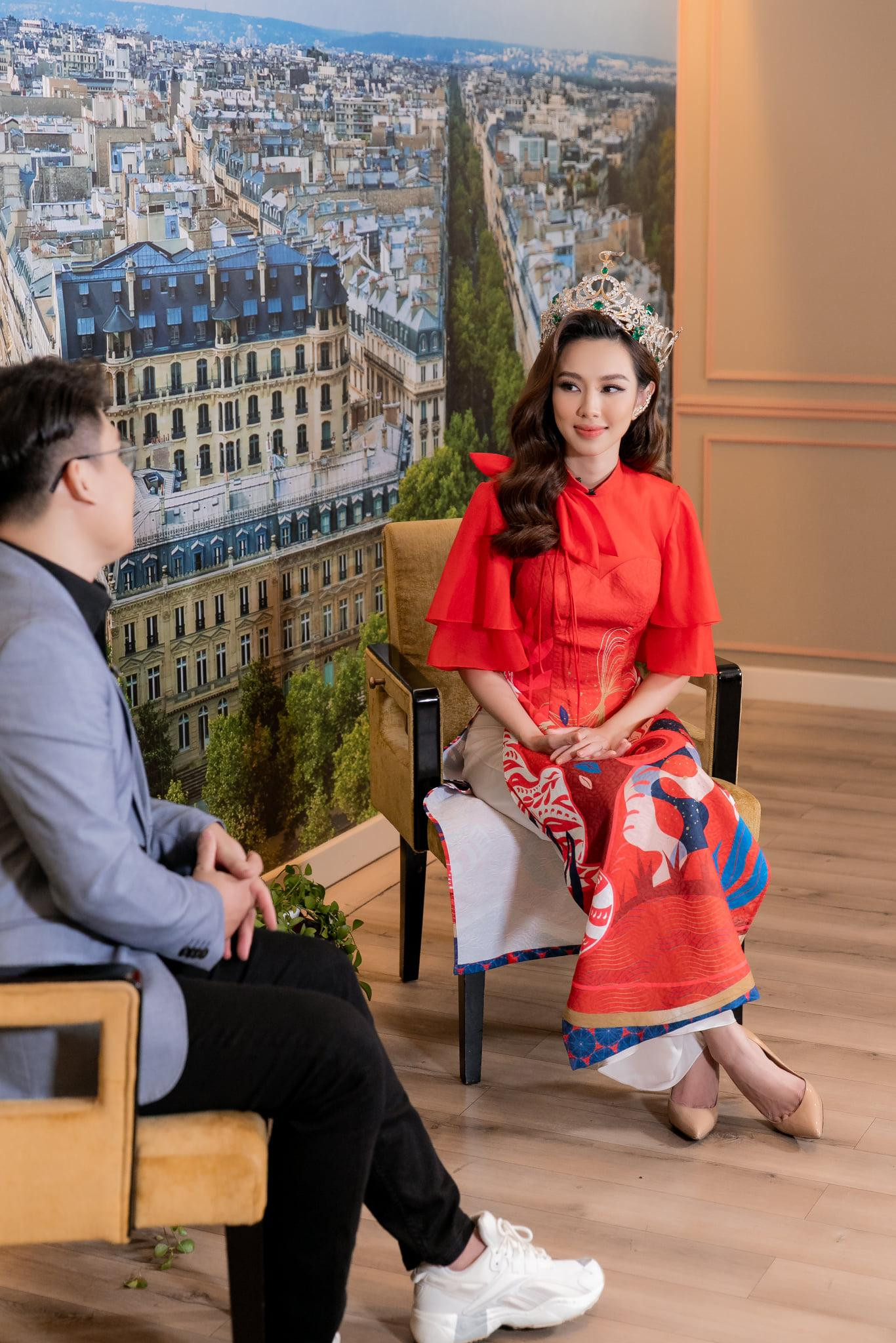 Mới đây, Thuỳ Tiên tiếp tục xuất hiện trong một cuộc phỏng vấn với đài truyền hình. Trong không khí Tết Nguyên Đán Nhâm Dần, nàng hậu đã chọn cho mình trang phục áo dài đỏ rực với những hoạ tiết đẹp mắt.