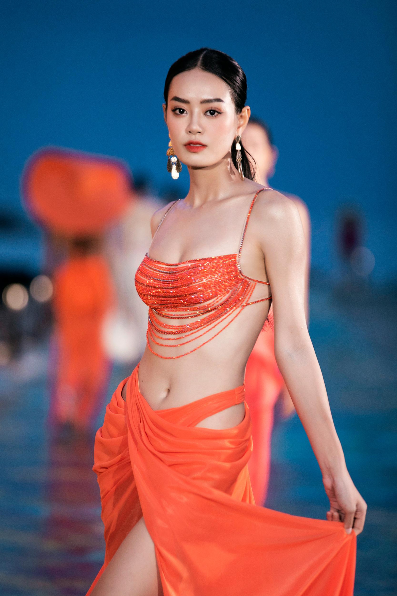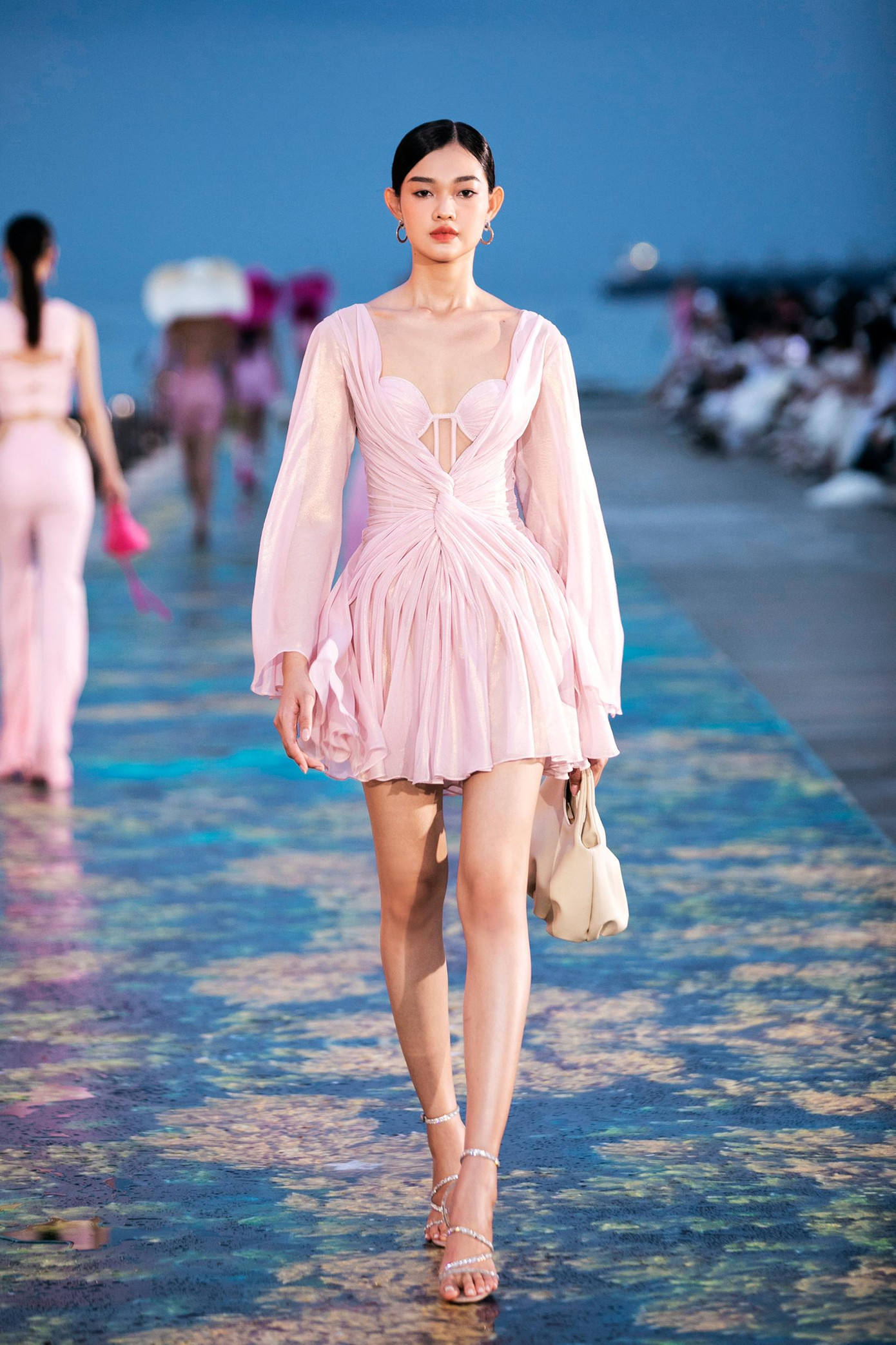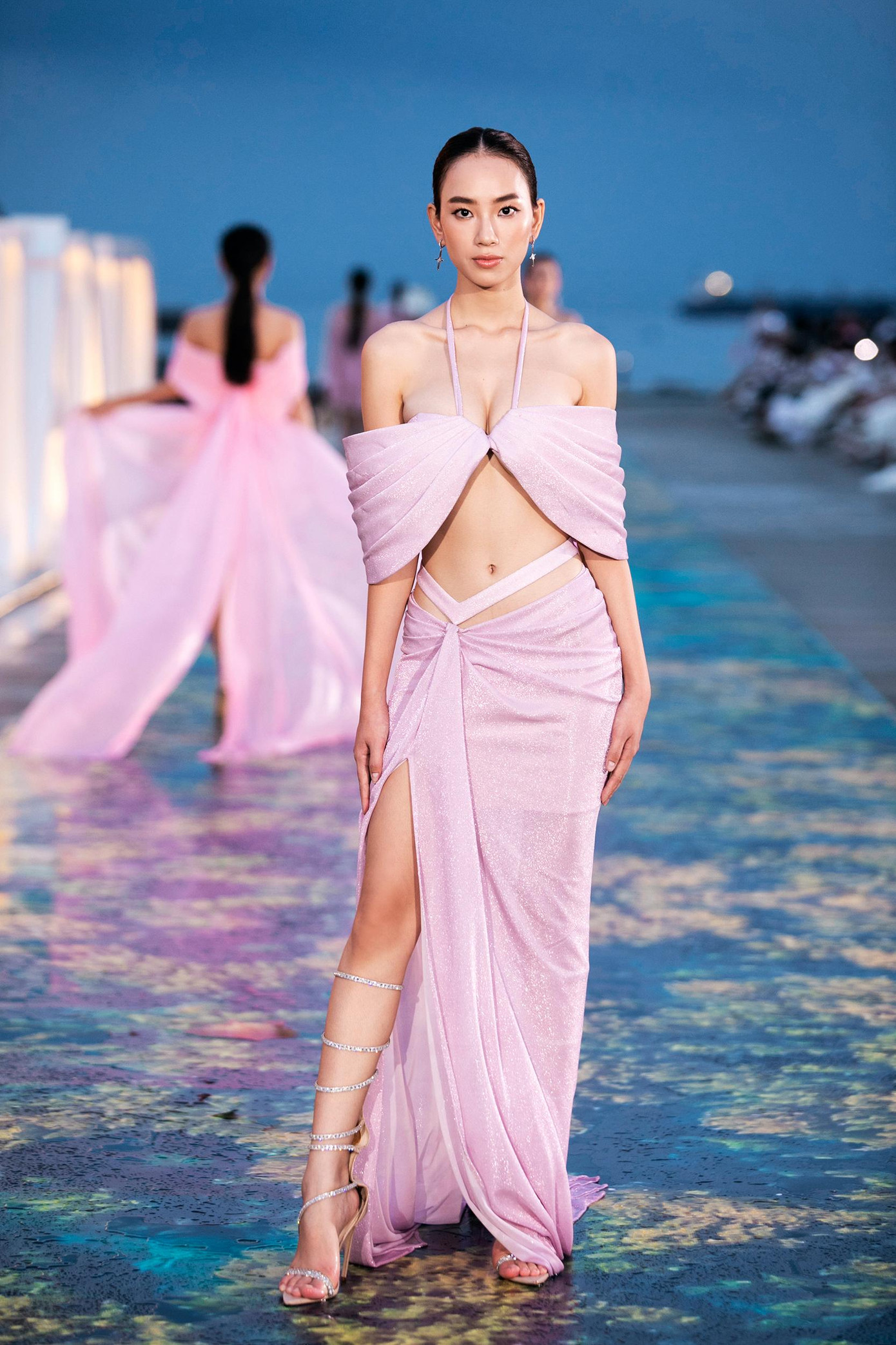 Catwalk trên đường runway dài 300 mét dọc bờ biển, Thuỳ Tiên gây chú ý khi khoác lên mình bộ váy tua rua xuyên thấu quyến rũ, lấp lánh. Thần thái và nhan sắc vô cùng kiêu sa của Thuỳ Tiên nhận được những tràng pháo tay cổ vũ nhiệt tình của khán giả.