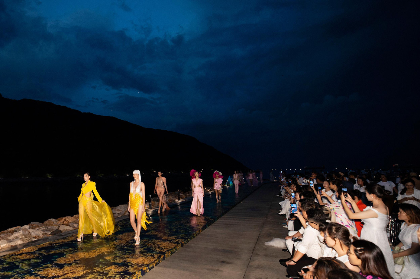 | Dàn người mẫu và thí sinh trình diễn trên sàn catwalk dài 300 mét dọc bờ biển. |