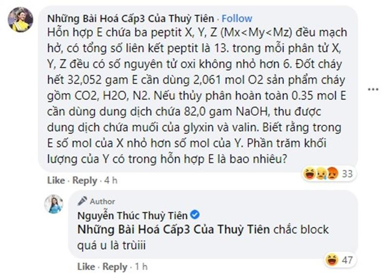 Như thương lệ, hai bức ảnh của Thùy Tiên nhận được không ít lời khen ngợi của người hâm mộ. Thế nhưng, bình luận đầu tiên được chú ý nhiều nhất lại là một bình luận khiến người đọc vô cùng choáng váng. Bình luận đến từ một fan lấy tên là “Những Bài Hóa Cấp 3 Của Thùy Tiên” với câu hỏi dài ngoằng về Hóa học, đọc xong chỉ muốn "té xỉu". Bình luận khiến Hoa hậu Thùy Tiên không khỏi cảm thán “chắc block quá u là trùiiii”.