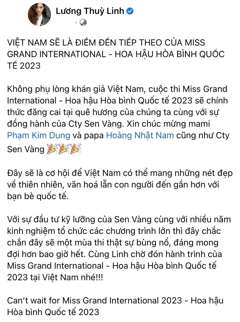 Hoa hậu Lương Thùy Linh tin rằng đây sẽ là cơ hội để Việt Nam có thể mang những nét đẹp về thiên nhiên, văn hóa lẫn con người đến gần hơn với bạn bè quốc tế. Hoa hậu Thùy Tiên hào hứng chia sẻ: "Chúc mừng Việt Nam đã trở thành điểm dừng chân tiếp theo trong hành trình của Miss Grand International - Hoa hậu Hòa bình Quốc tế vào năm 2023".