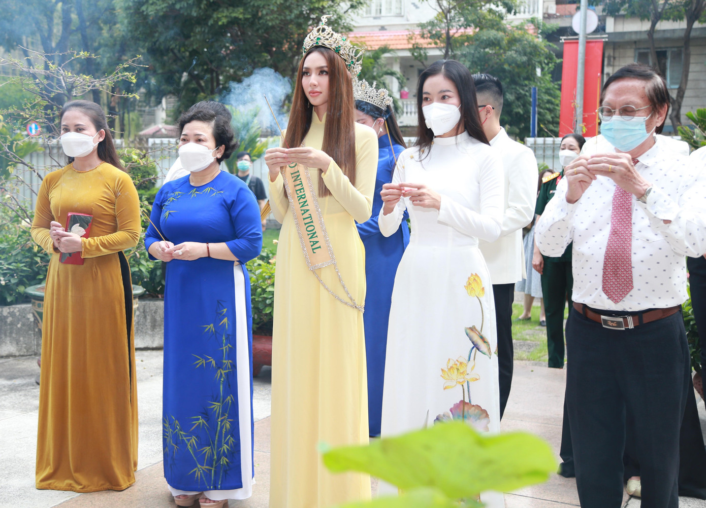 | Trước khi diễn ra phần lễ trao tặng các trang phục đặc biệt, Hoa hậu Thùy Tiên và đại diện Bảo tàng Phụ nữ Nam Bộ đã tiến hành dâng hương tưởng nhớ các Mẹ Việt Nam Anh hùng, những người phụ nữ bất khuất, trung hậu của đất nước. |