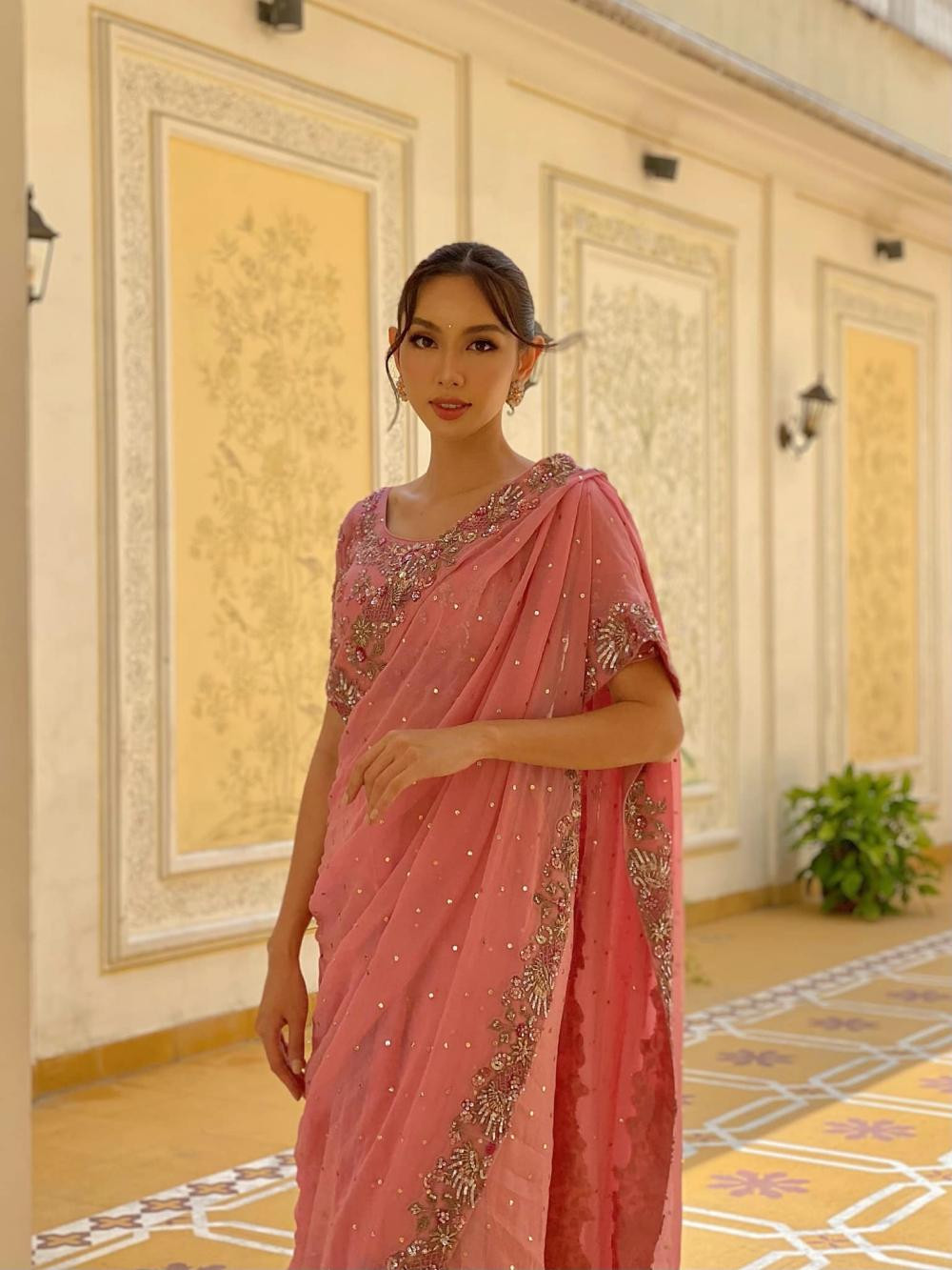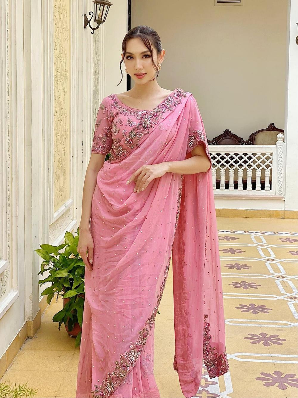 Trang phục truyền thống Ấn Độ luôn gây ấn tượng mạnh với cộng đồng quốc tế vì nét đặc trưng rất riêng. Vì thế khi tới đây, Hoa hậu Thùy Tiên cũng không bỏ lỡ cơ hội mặc những bộ saree độc đáo này. Thùy Tiên mặc saree màu hồng, đính đá lấp lánh rất dịu dàng, xinh đẹp như một nàng công chúa Ấn Độ.