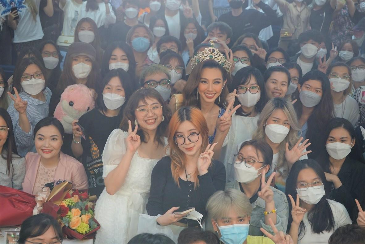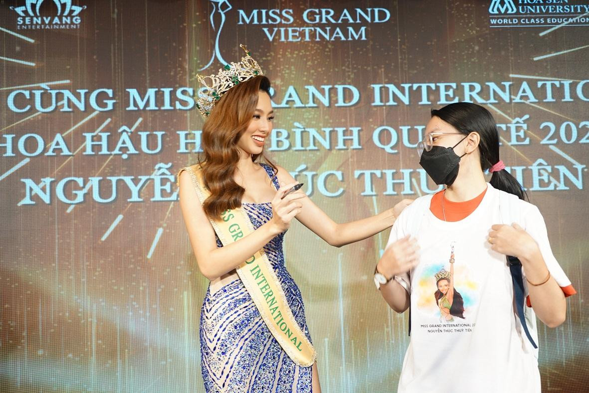 "Tiên cảm thấy bất ngờ khi được các bạn và thầy cô đón chào nồng nhiệt như thế này. Tiên mong những chia sẻ của mình có thể truyền cảm hứng tích cực và sự ủng hộ của mọi người sẽ là nguồn động viên để mình hoàn thành những việc cần làm và vươn lên”, Hoa hậu Nguyễn Thúc Thùy Tiên xúc động trước sự đón chào của thầy cô và các bạn cùng trường.