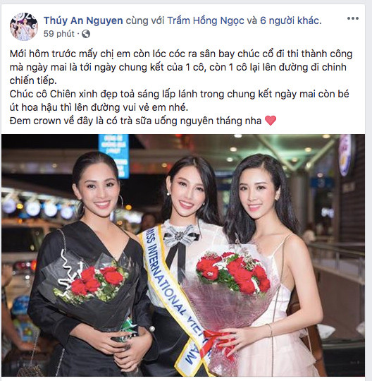 Ngoài ra Á hậu 2 Thúy An, người “nhường lại” cơ hội đại diện Việt Nam tham dự HH Quốc Tế cho Thùy Tiên do lý do sức khỏe, cũng gửi lời động viên đầy ngọt ngào “hứa sẽ mua trà sữa nguyên tháng cho Tiên” ngày Tiên mang vương miện trở về.