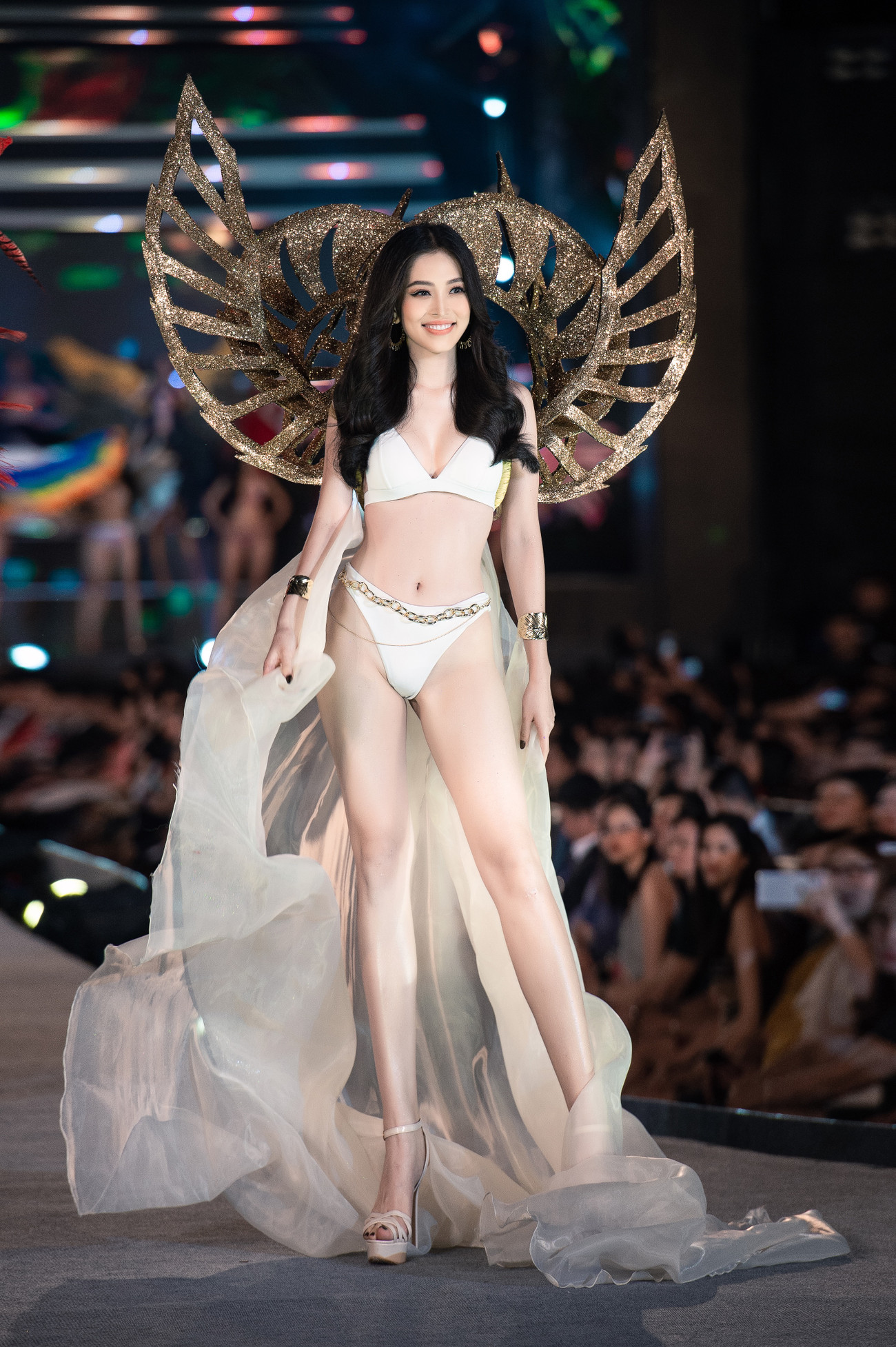 Top 35 thí sinh HHVN 2020 cùng Hoa hậu Tiểu Vy, Á hậu Phương Nga, Á hậu Thúy An trình diễn trang phục bikini kết hợp những đôi cánh carnival tạo nên lễ hội sống động trên sân khấu phần thi Người đẹp Biển.
