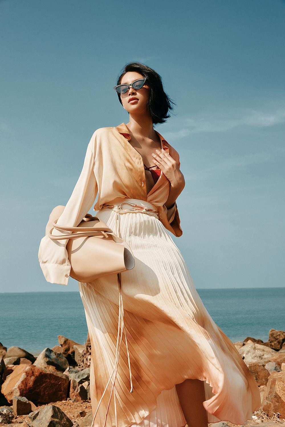 | Các kiểu váy xếp ly với tông màu rực rỡ, họa tiết bắt mắt giúp HHVN 2018 nổi bật khi khoe dáng trước biển. |
