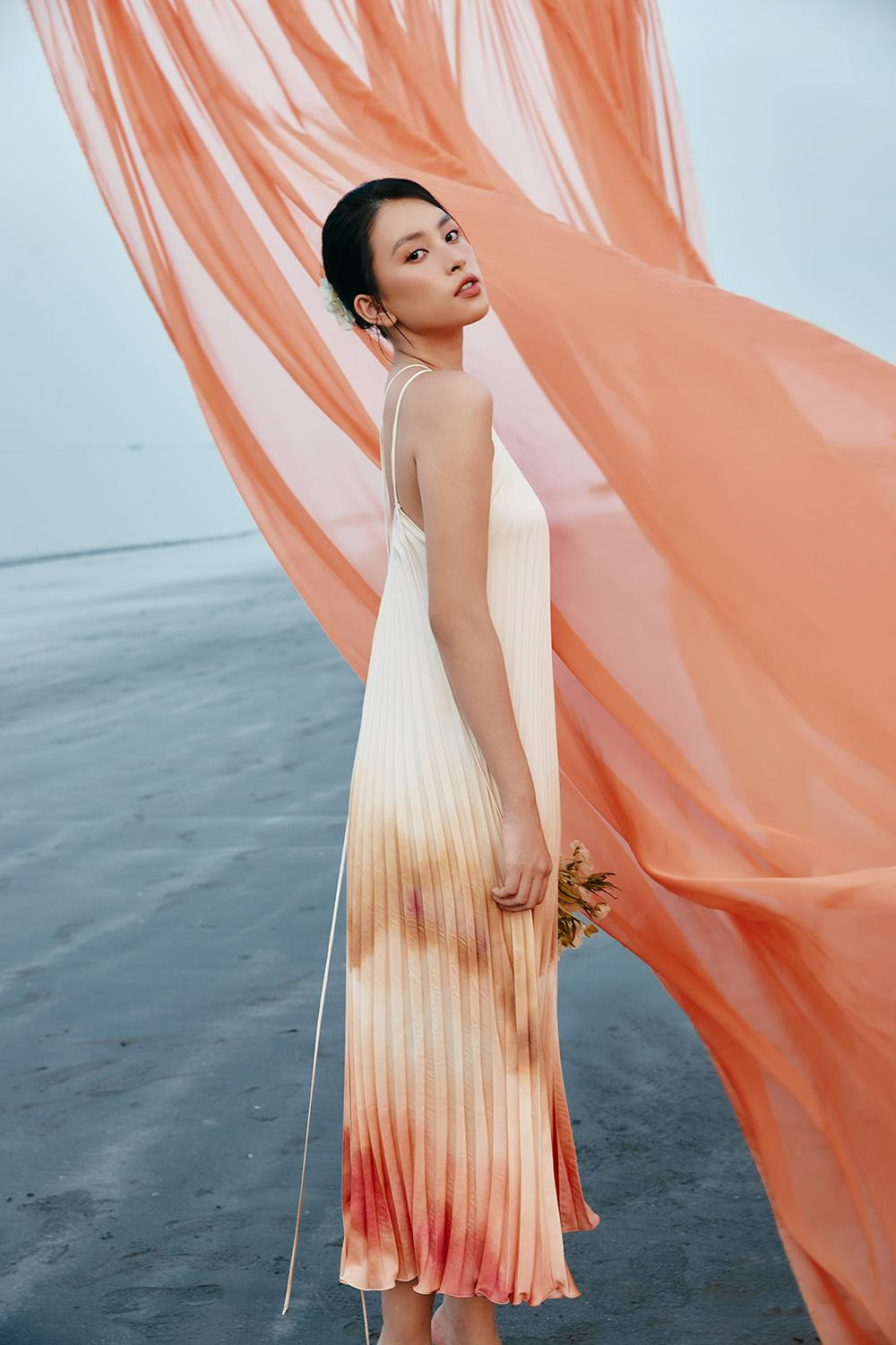 | Hoa hậu Việt Nam 2018 hóa 'nàng thơ' quyến rũ khi diện váy xếp ly hiệu ứng loang màu lạ mắt, khoe lưng trần nuột nà. |