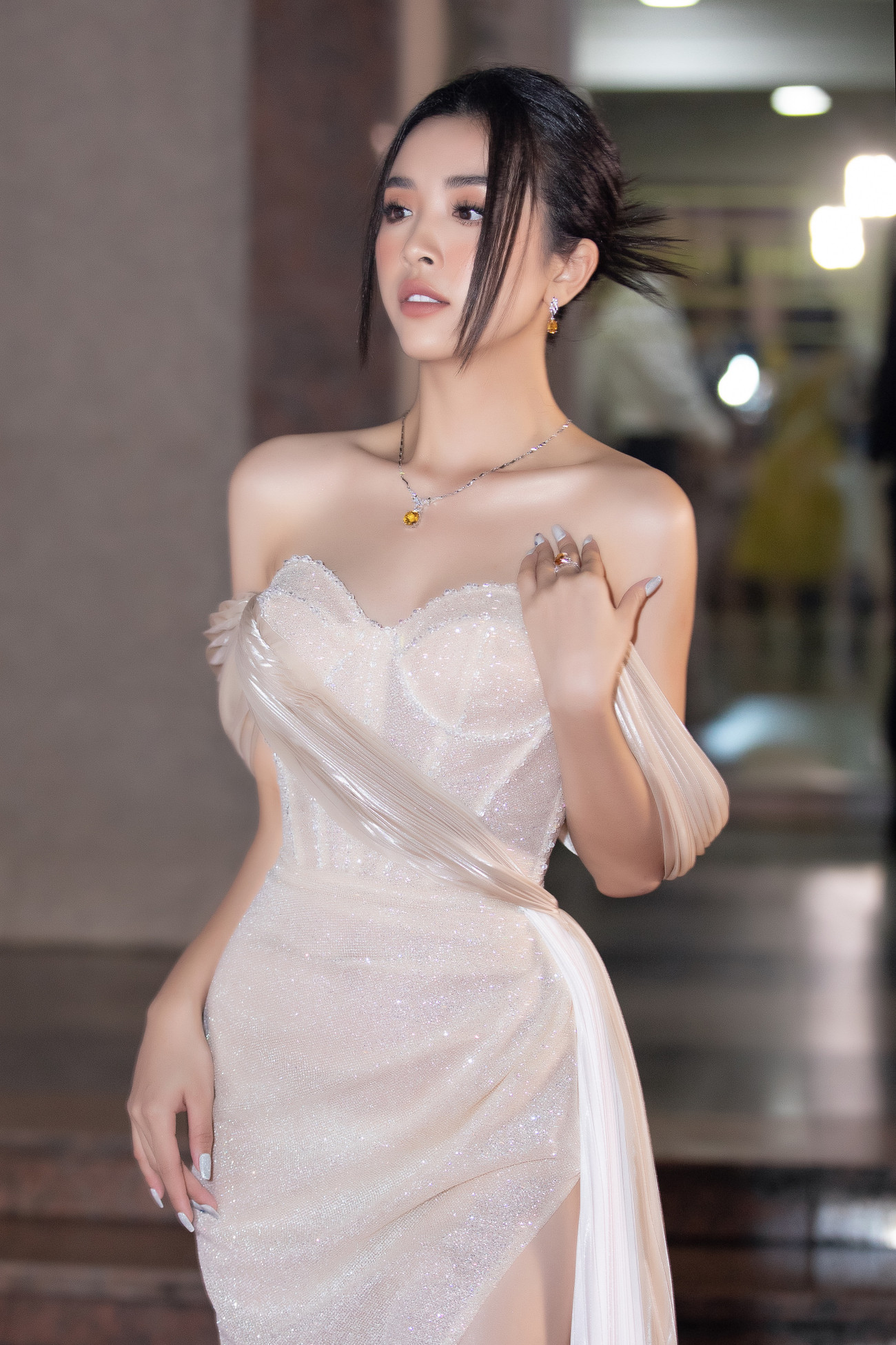 Á hậu Thuỵ Vân quyến rũ với đầm hồng lệch vai.