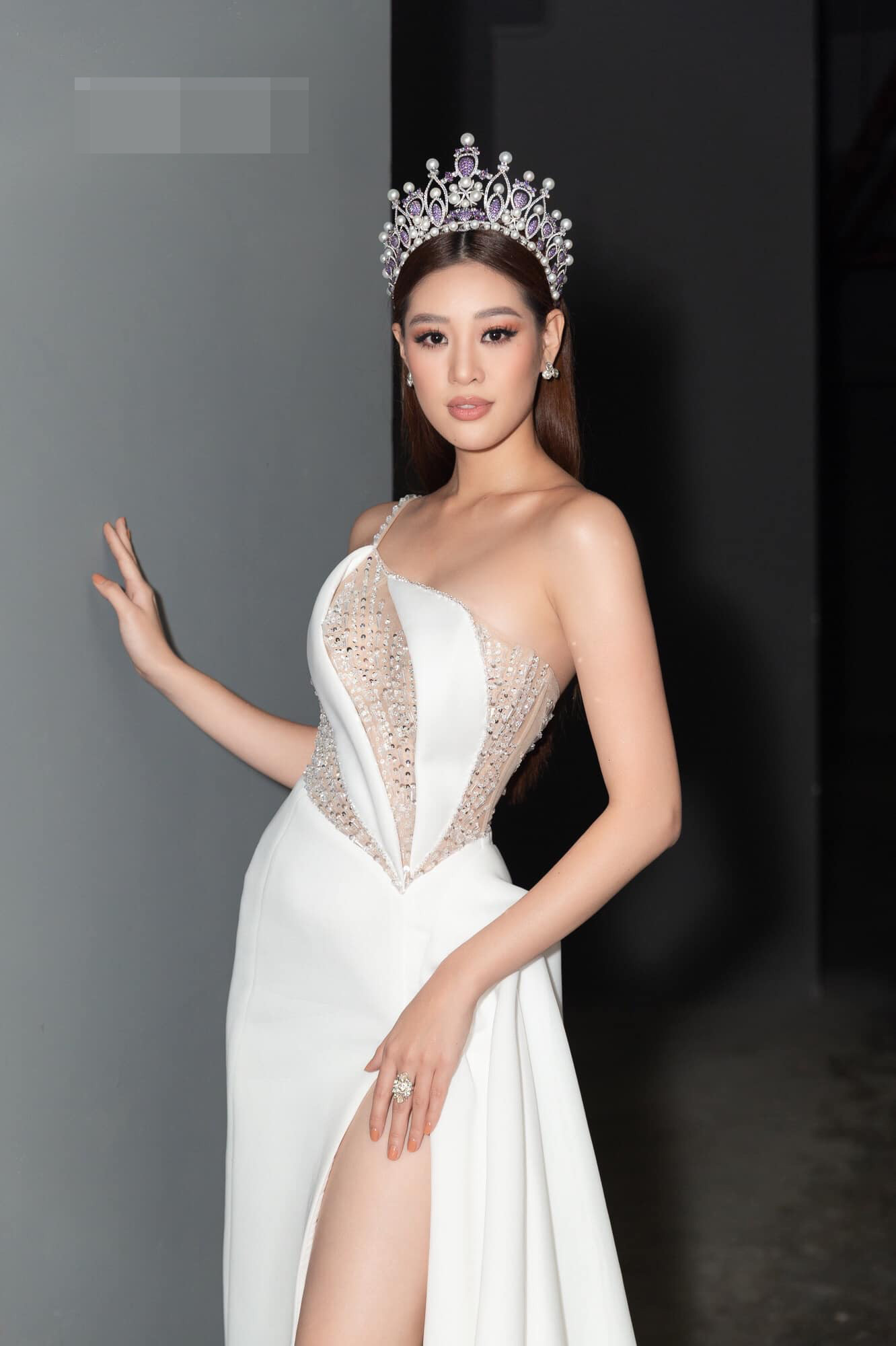 Hoa hậu Khánh Vân khoe chân dài nuột nà với bộ váy dạ hội màu trắng tinh khôi.