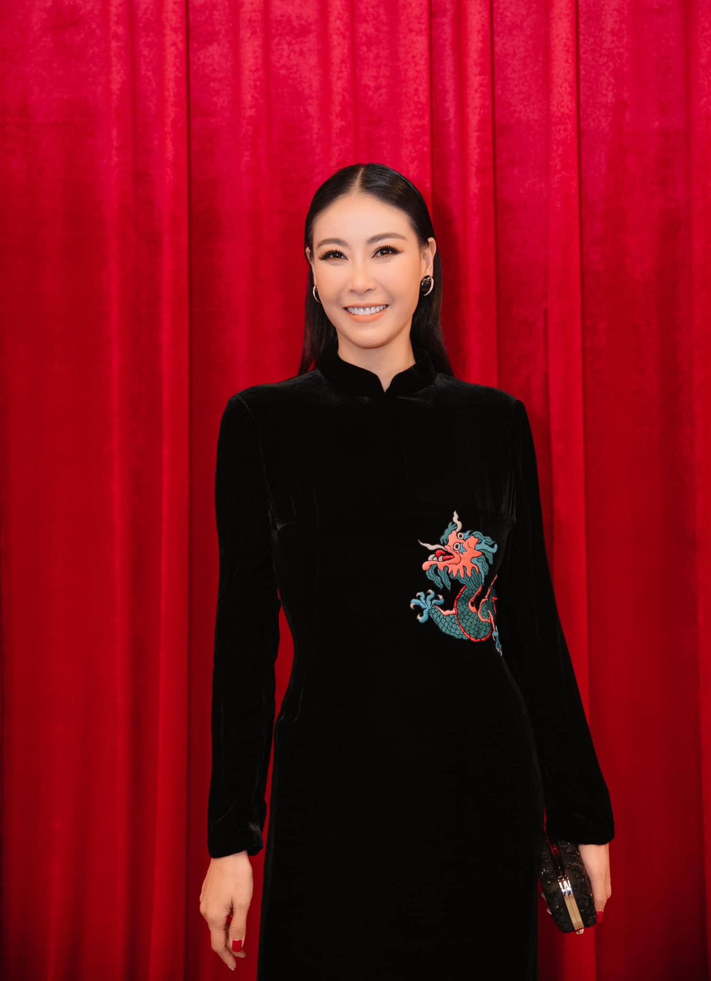 Bộ áo dài với điểm nhấn là hoạ tiết rồng ở vòng eo mang lại vẻ bí ẩn cho Hoa hậu Việt Nam 1992.
