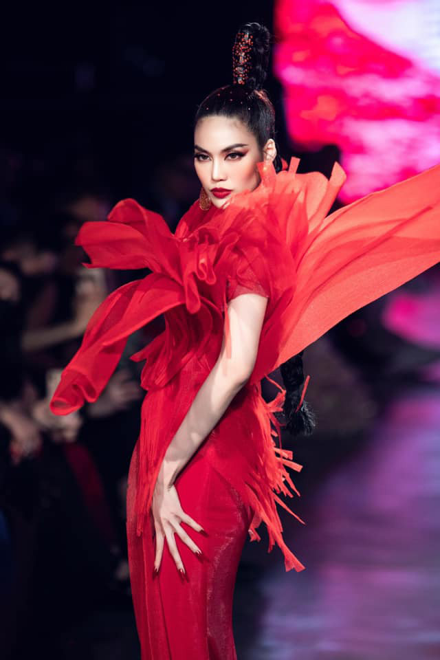 Người đẹp chinh phục sàn diễn với bộ váy gam màu đỏ rực cùng thần thái 'vạn người mê' của mình.
