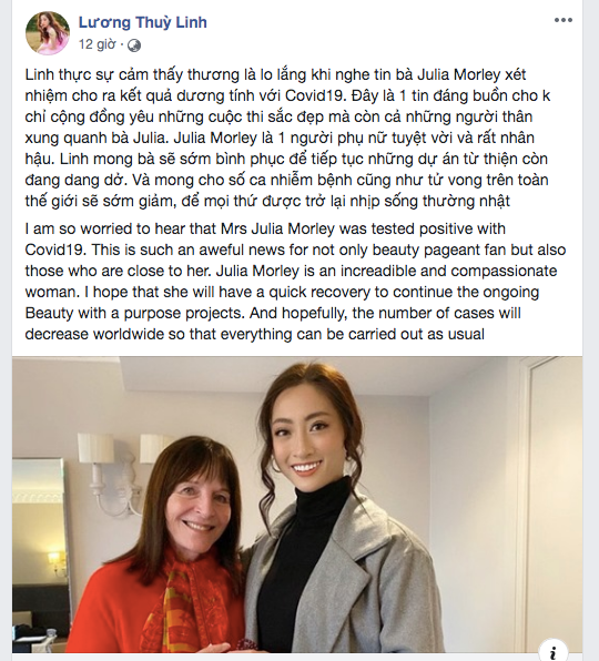 Hoa hậu Lương Thuỳ Linh cũng bày tỏ sự lo lắng trên trang cá nhân. Cô viết: "Linh thực sự cảm thấy thương là lo lắng khi nghe tin bà Julia Morley xét nhiệm cho ra kết quả dương tính với Covid-19. Đây là 1 tin đáng buồn cho k chỉ cộng đồng yêu những cuộc thi sắc đẹp mà còn cả những người thân xung quanh bà Julia".