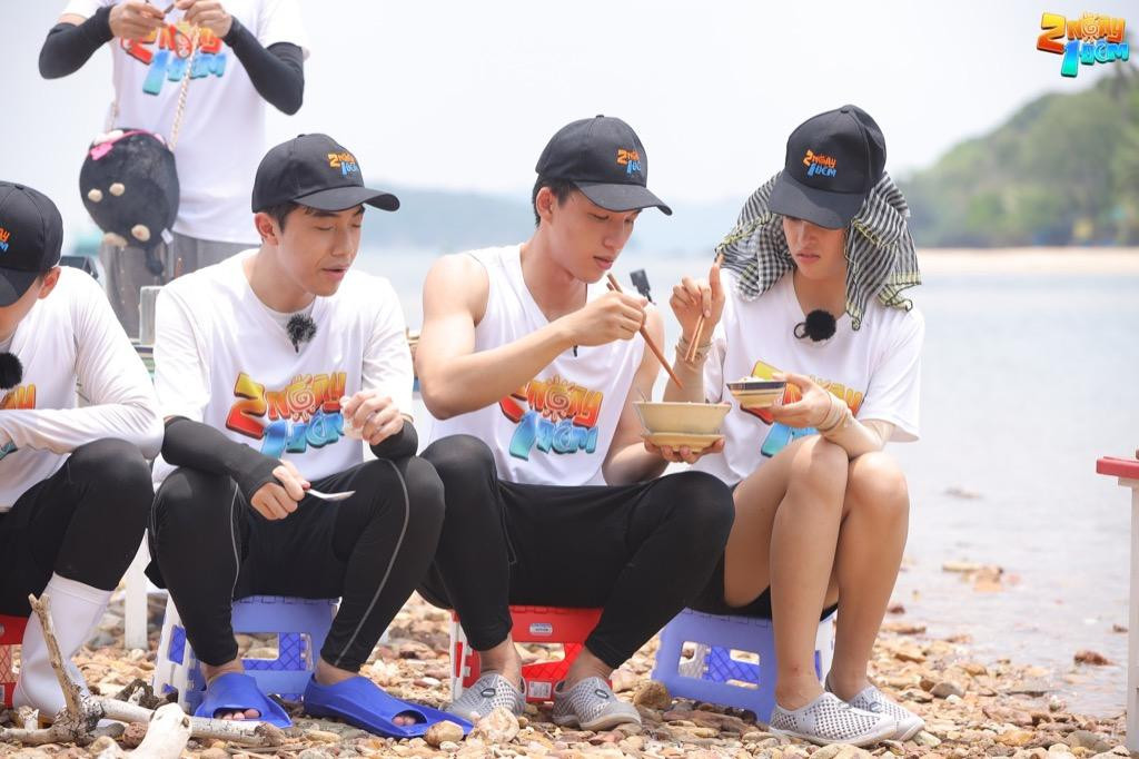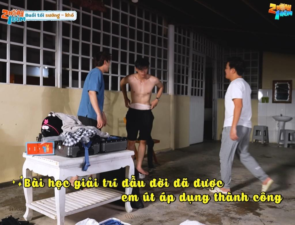 Ngược lại, 2 "anh già" Trường Giang - Kiều Minh Tuấn và cậu út HIEUTHUHAI phải đành lòng chấp nhận cuộc sống thiếu thốn khi phải tắm chung một vòi nước và ngủ ngoài trời. Đây là lần đầu tiên HIEUTHUHAI phải tắm "lộ thiên" cùng 2 đàn anh và có máy quay theo sát ghi hình nên anh chàng không tránh khỏi bẽn lẽn, ngượng ngùng.