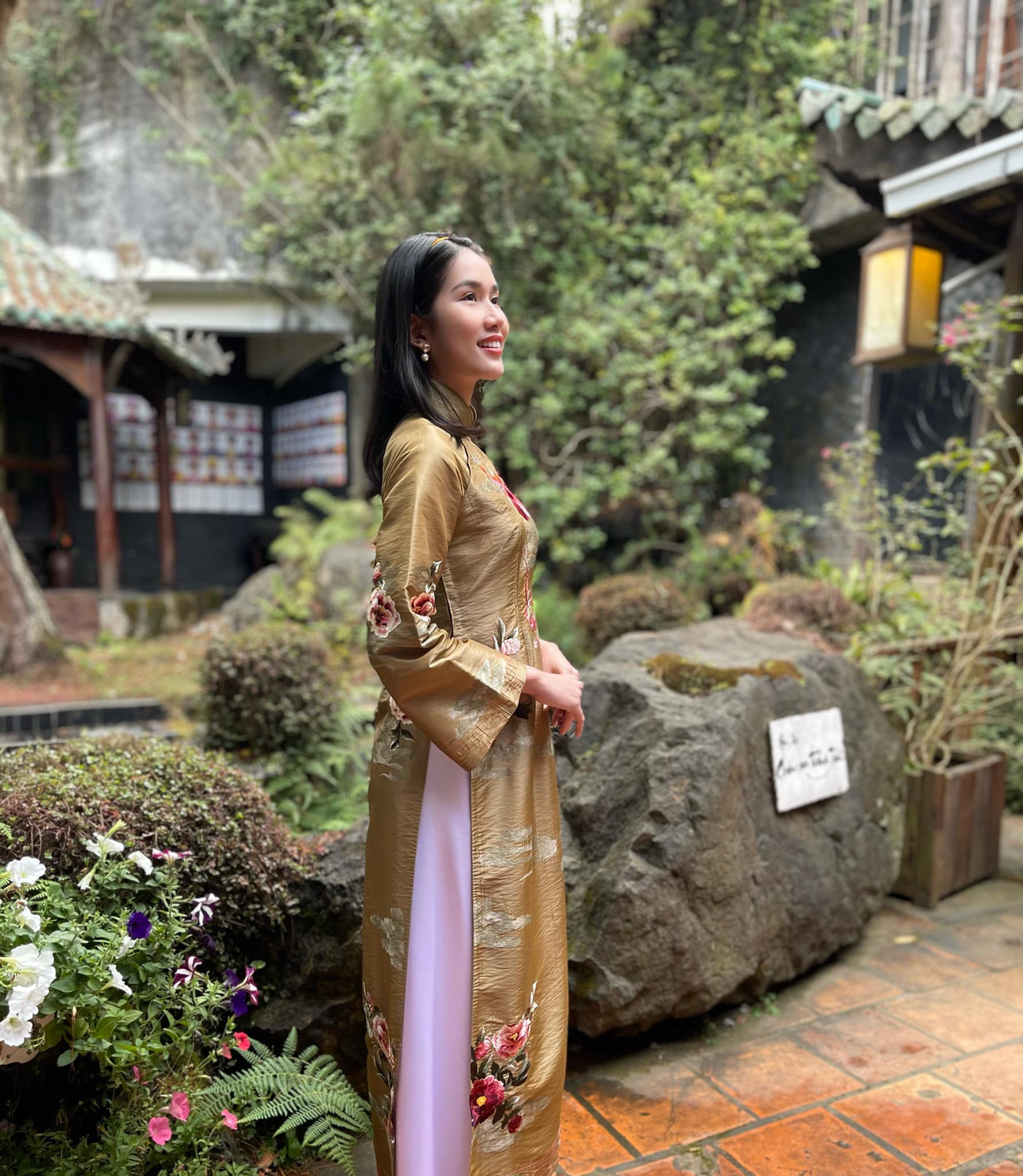 Cô diện áo dài có hoạ tiết hoa rực rỡ tại Đà Lạt mộng mơ.