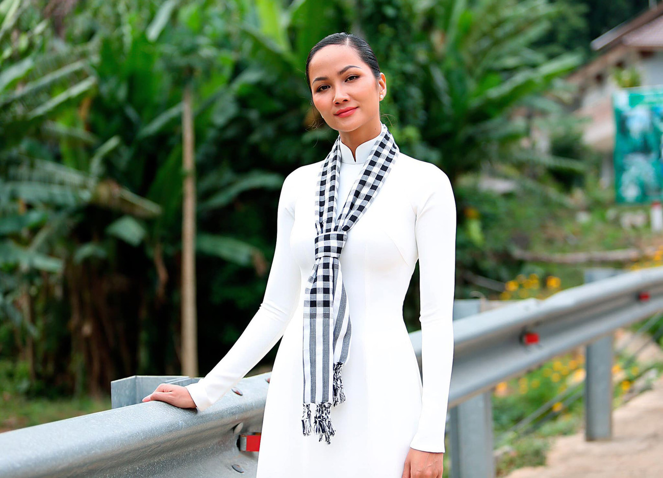 Hoa hậu H'Hen Niê nền nã khi diện áo dài trắng và đeo khăn rằn.