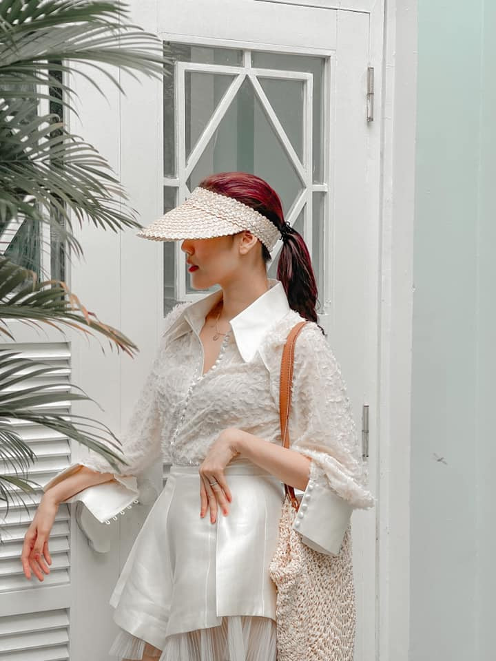 Hoa khôi Lan Khuê yêu kiểu như một nàng tiểu thư với trang phục tông màu trắng.
