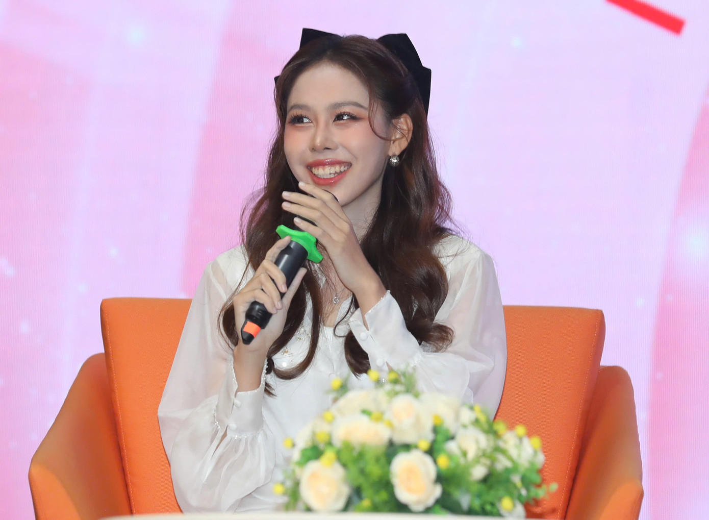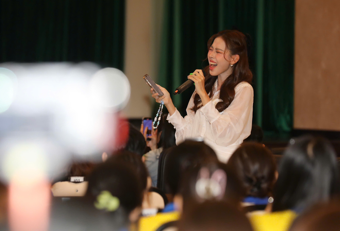 Trong phần tiếp theo của buổi giao lưu, Ngọc Hằng chia sẻ về vòng thi phỏng vấn kín đầy gắt gao. “Bác sĩ nhân trắc học kiểm tra kỹ, từ mũi, cằm, răng, mọi thứ trên cơ thể. Điều đó áp lực nhất. Tuy nhiên, cuộc thi hoa hậu không chỉ tìm cô gái ngoại hình đẹp. Hoa hậu phải có nội tâm, sẵn sàng cho việc chịu được sức nặng của vương miện”, Ngọc Hằng nói thêm.