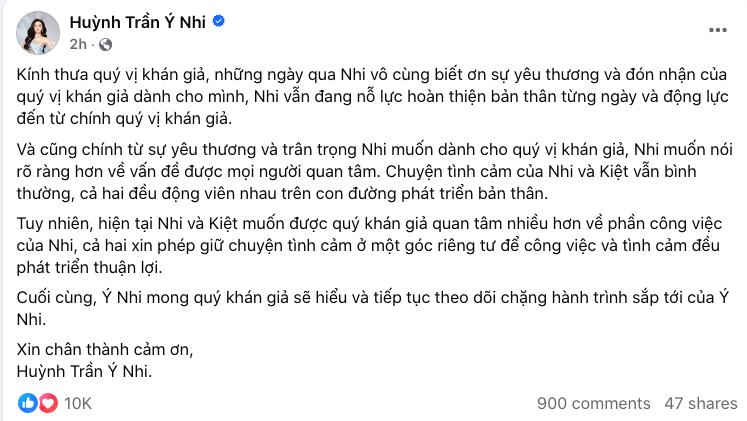 Trước nhiều luồng thông tin đồn đoán, Hoa hậu Ý Nhi đã chính thức lên tiếng trên trang cá nhân, cô khẳng định: “… Chuyện tình cảm của Nhi và Kiệt vẫn bình thường, cả hai đều động viên nhau trên con đường phát triển bản thân. Tuy nhiên, hiện tại Nhi và Kiệt muốn được quý khán giả quan tâm nhiều hơn về phần công việc của Nhi, cả hai xin phép giữ chuyện tình cảm ở một góc riêng tư để công việc và tình cảm đều phát triển thuận lợi…”