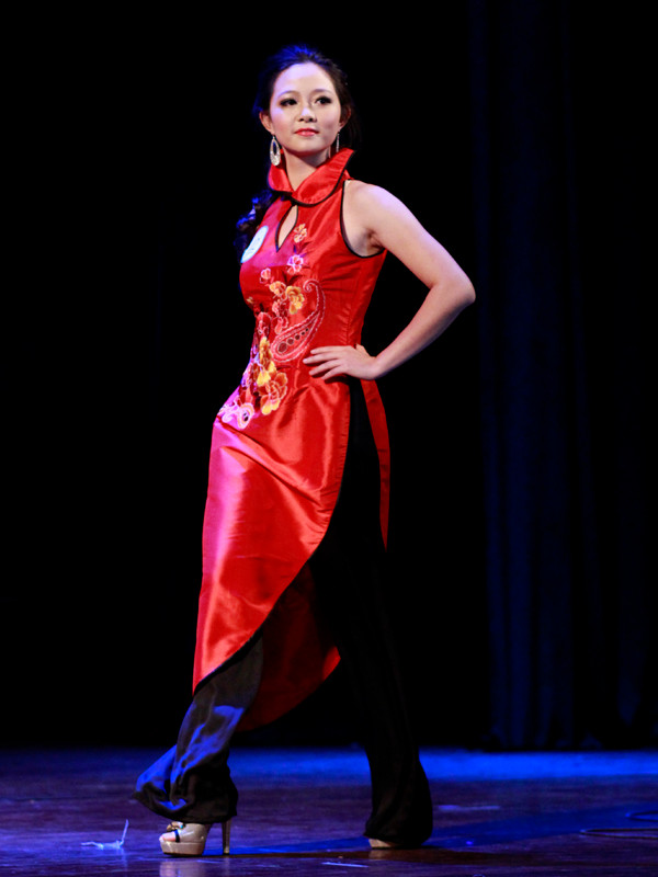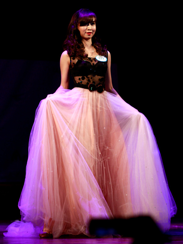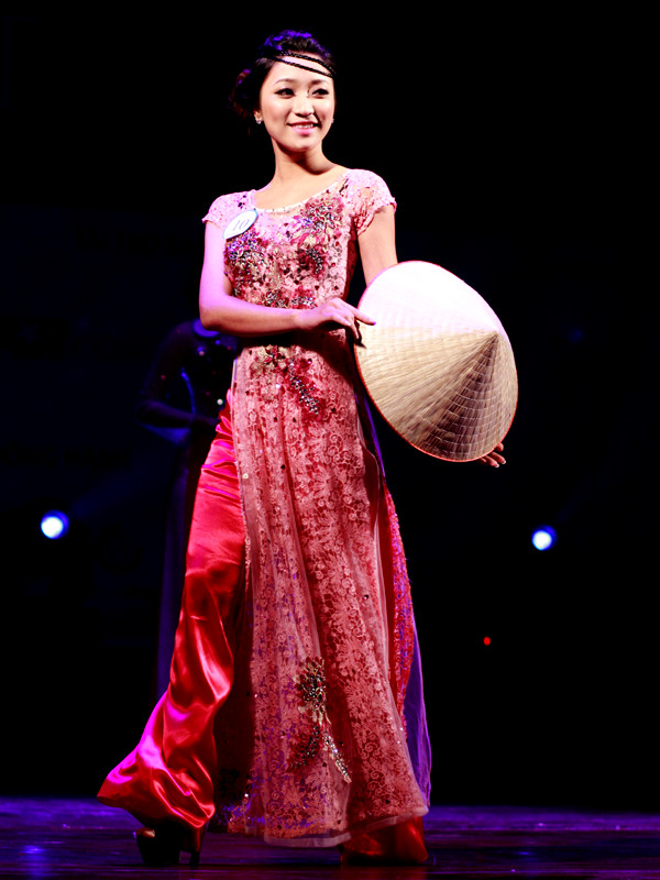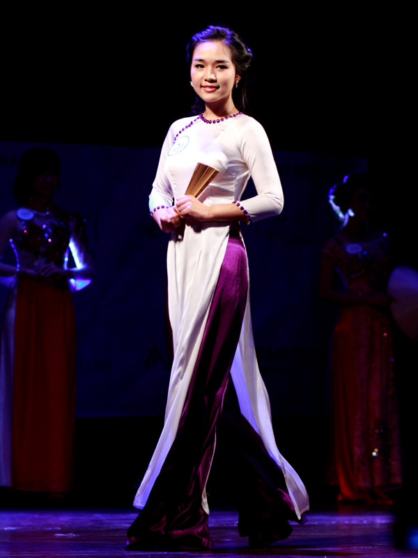 Tiếp đến là phần thi trình diễn áo dài. Tùy theo chiếc áo dài, các thí sinh đã có những phụ kiện biểu diễn khác nhau như chiếc đèn lồng, nón lá... Giải trình diễn áo dài thuộc về thí sinh Nguyễn Mai Ly.