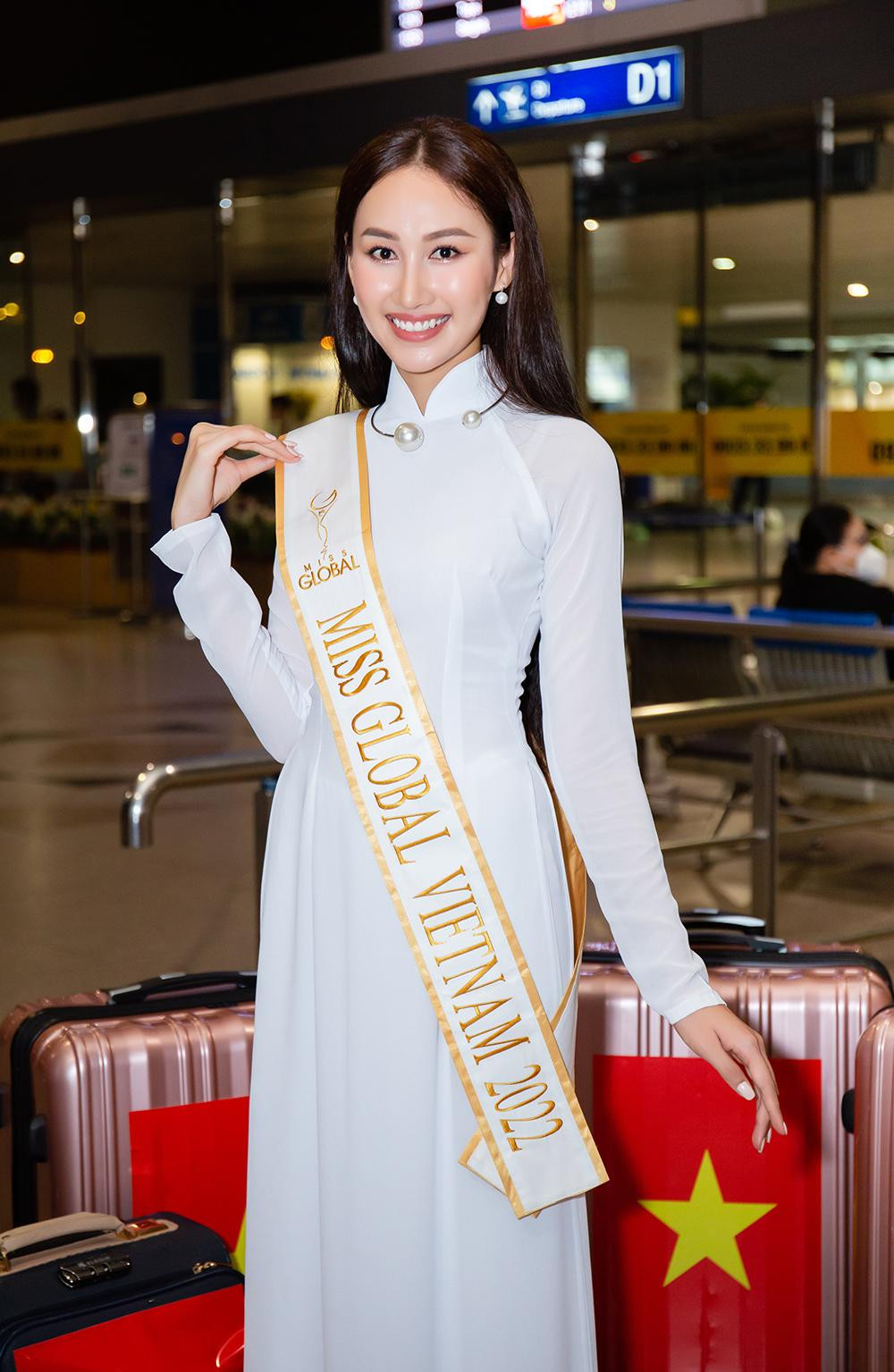 | Đoàn Hồng Trang diện áo dài trắng tinh khôi lên đường dự thi Miss Global 2022. |
