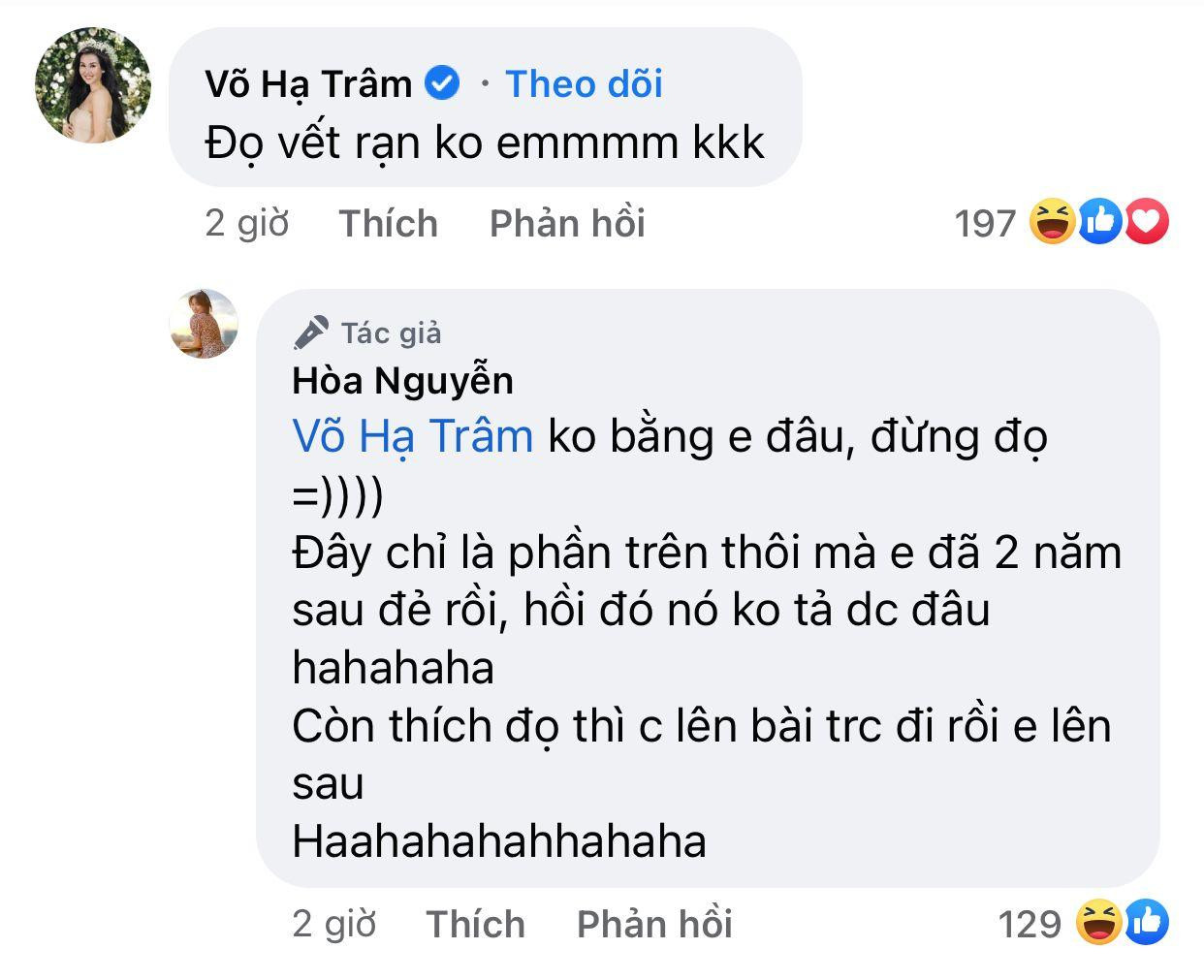 Ngay sau đó, bài viết của Hòa Minzy đã nhận được nhiều sự yêu thích và đồng cảm từ cộng đồng mạng. Chẳng những thế, nữ ca sĩ Võ Hạ Trâm còn bình luận rủ rê Hòa Minzy cùng "đọ vết rạn". Tiếp lời Võ Hạ Trâm, mẹ bé Bo cũng hài hước đáp lại: "Không bằng em đâu, đừng đọ. Đây chỉ là phần trên thôi mà em đã 2 năm sau đẻ rồi. Hồi đó nó không tả được đâu. Còn thích đọ thì chị lên bài trước đi rồi em lên sau".