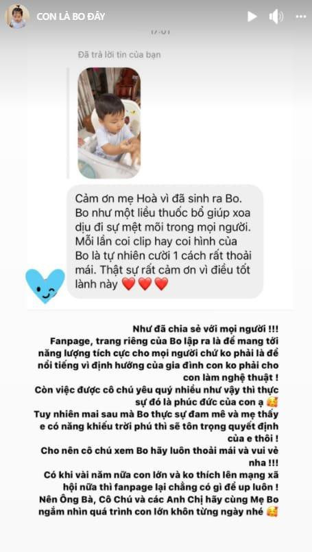 Trước đó, Hòa Minzy cũng có những chia sẻ gây chú ý, khi nữ ca sĩ đề cập đến định hướng tương lai của bé Bo. Hiện tại, fanpage và tài khoản Instagram của bé Bo đều nhận được lượt theo dõi "khủng", vì thế nhiều netizen cho rằng bé Bo cũng được xem như một người nổi tiếng. Tuy nhiên, Hòa Minzy đã khẳng định: "Fanpage, trang riêng của Bo lập ra là để mang đến năng lượng tích cực cho mọi người chứ không phải là để nổi tiếng. Vì định hướng của gia đình con không phải là cho con theo con đường nghệ thuật."