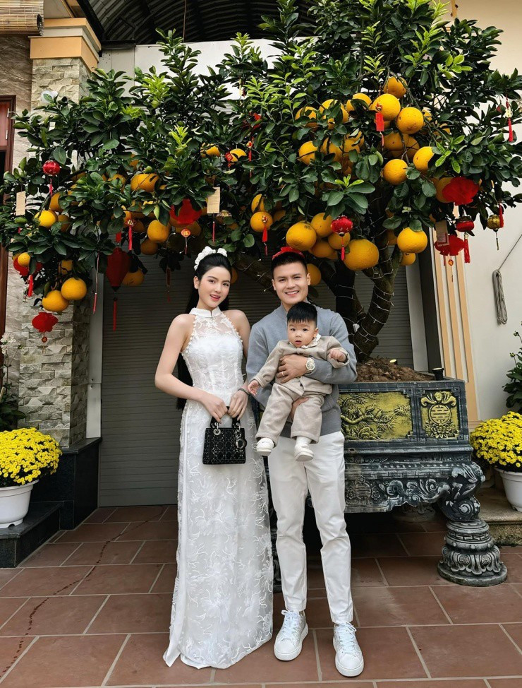 Trùng hợp thay, vợ chồng Chu Thanh Huyền và Quang Hải cũng có tấm ảnh kỷ niệm với bối cảnh tương tự trong những ngày Tết. Gia đình ba người cũng tạo dáng trước chiếc tủ kính lớn bày kín các thành tích mà Quang Hải đã đạt được trong sự nghiệp cầu thủ của mình. Xem ra cả hai nàng dâu xinh đẹp của làng bóng đá Việt Nam đều rất tự hào với bảng thành tích đáng nể của ông xã.