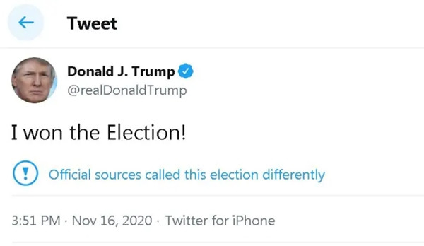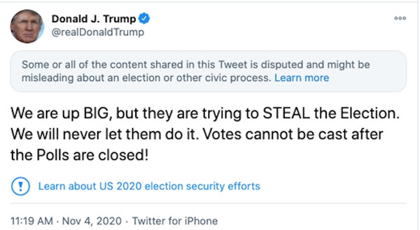 Tua nhanh đến năm nay, Tổng thống Trump lại dùng “tuyệt chiêu” ưa thích của mình, là tuyên bố rằng cuộc bầu cử có gian lận, rằng đối thủ Joe Biden “đánh cắp cuộc bầu cử”. Mặc dù mọi bài đăng kiểu này của ông đều bị Twitter gắn cảnh cáo là gây tranh cãi hoặc sai lạc.