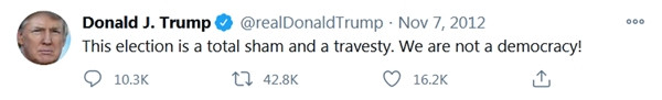 Sau kỳ bầu cử năm 2012, khi Tổng thống Barack Obama tái đắc cử, ông Trump đã bảo rằng cuộc bầu cử là “sự giả tạo hoàn toàn” và một “trò lừa bịp”. Ông thậm chí viết lên Twitter: “Chúng ta không thể để điều này xảy ra. Chúng ta nên chặn trò lừa bịp này lại”. Tất nhiên, ông không đưa ra được bằng chứng nào.