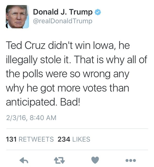Khi tranh cử để trở thành ứng cử viên của Đảng Cộng hòa vào năm 2016, ông Trump cũng cố gieo rắc nghi ngờ đối với quá trình bầu cử. Ông nói ông không hề thua trong các cuộc họp kín (để chọn ứng cử viên) ở bang Iowa, bởi “đối thủ” của ông lúc đó là Thượng nghị sĩ Ted Cruz đã “đánh cắp” nó. Vào thời điểm này, ông Trump viết lên Twitter: “Ted Cruz không hề thắng ở Iowa, ông ta đánh cắp nó. Đó là lý do mà ông ta nhận được nhiều phiếu hơn mức dự đoán. Tồi tệ!”.