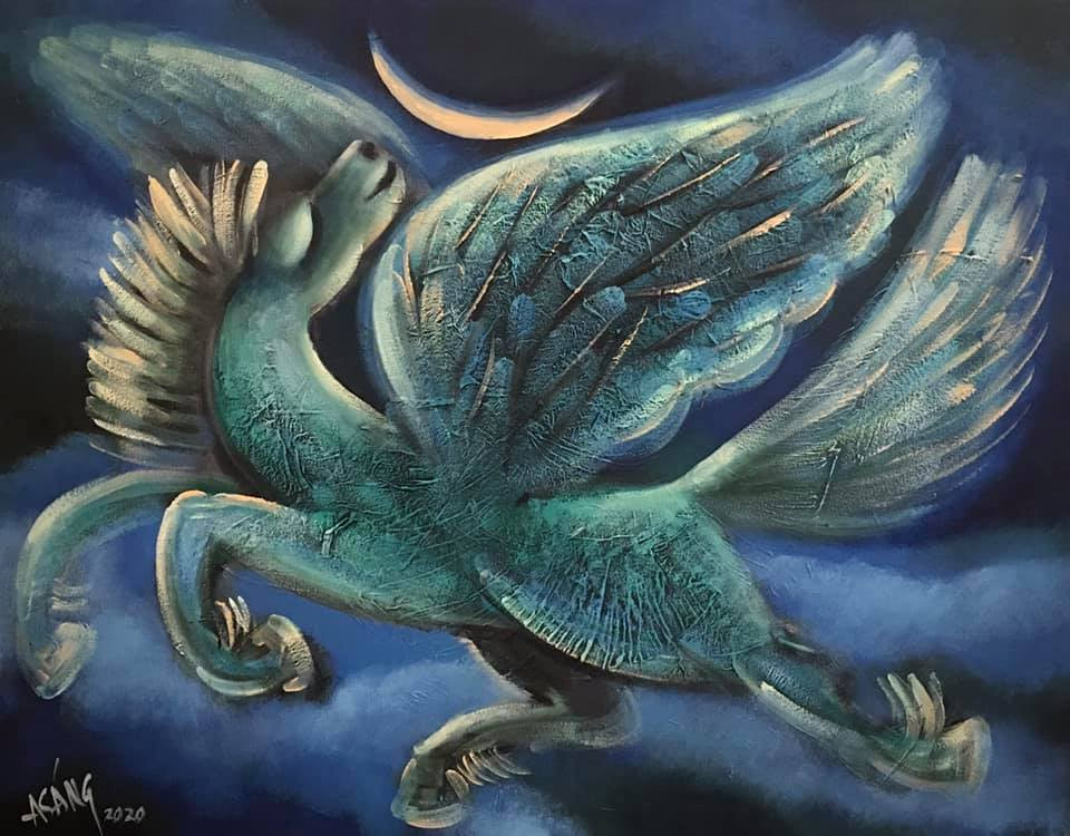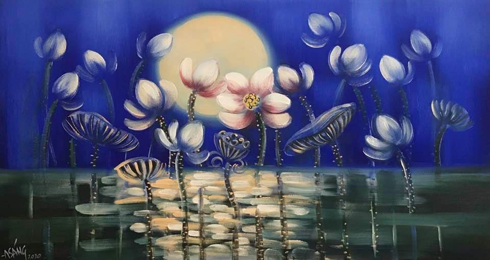 Hoàng A Sáng: Đó là điều tự nhiên. Con người mình thế nào thì nghệ thuật của mình như vậy. Tôi có ngoại hình sù sì, đen đúa vì tuổi thơ chăn bò, phải lăn lộn ở thành phố để kiếm sống. Ai gặp tôi cũng nghĩ ngay đến một gã người Tày ghê gớm, quyết liệt, thậm chí cục súc… Tôi lại thích bông đùa, ưa hài hước, hay tếu táo… Thế nên khi xem tranh của tôi không ít người bị bất ngờ, bởi sự trái ngược giữa hình thức của con người và nghệ thuật. Thực ra, sâu thẳm bên trong tôi vẫn vẹn nguyên sự êm ả, hiền lành như dòng suối của bản Pác Thay, nơi tôi sinh ra.
