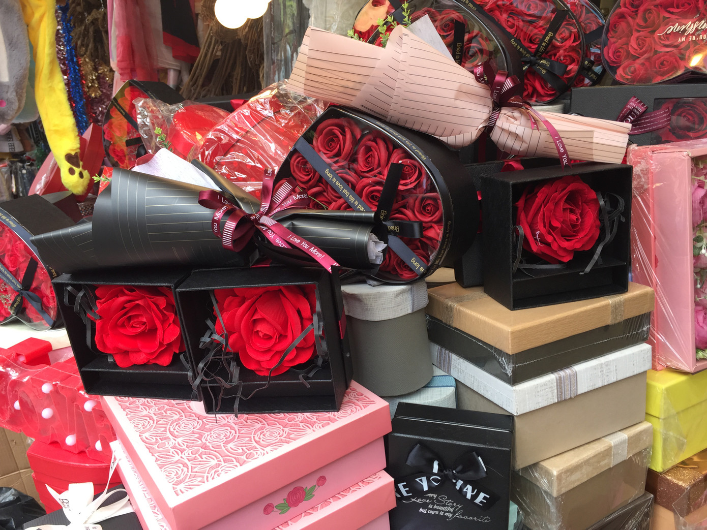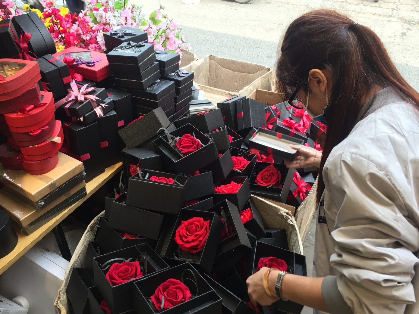 Hoa hồng xếp theo hộp, đặc biệt có loại thiết kế sẵn ngăn đựng son, nhẫn, trang sức, … giá chỉ khoảng 100.000 đồng/ hộp, bán rất chạy. Sản phẩm được nhiều cửa hàng kinh doanh mỹ phẩm “săn lùng” để phục vụ khách hàng dịp Valentine.