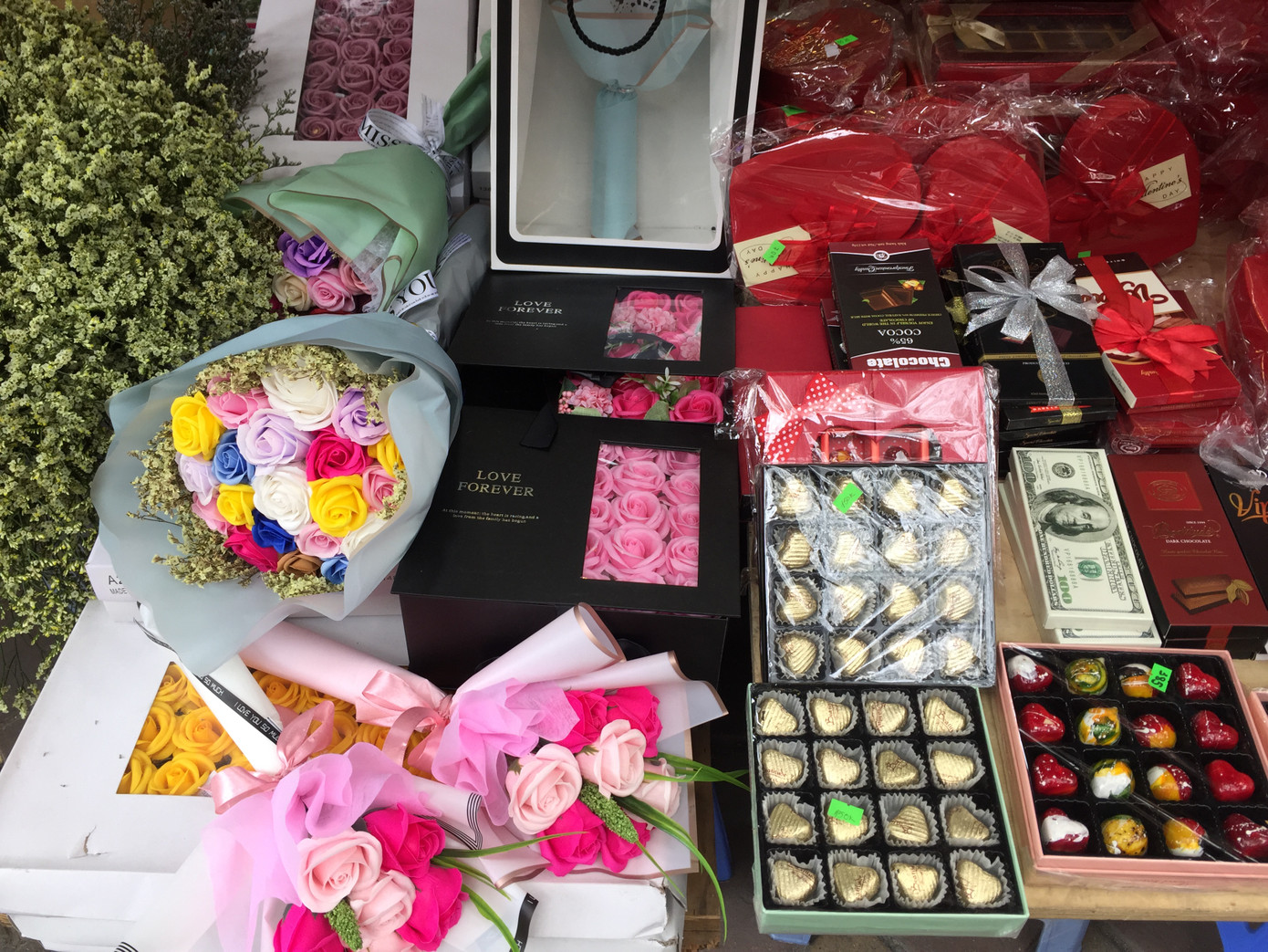 Ngoài hoa hồng, không thể thiếu trong dịp Valentine là socola. Cũng tại các cửa hàng bán đồ lưu niệm, còn bày bán thêm nhiều loại socola, được quảng cáo là hàng ngoại, giá rẻ chỉ khoảng 70.000 - 100.000 đồng/ thanh nhưng mập mờ thương hiệu, nguồn gốc xuất xứ. Loại đựng trong hộp có giá cao hơn, từ 150.000 – 400.000 đồng/ hộp