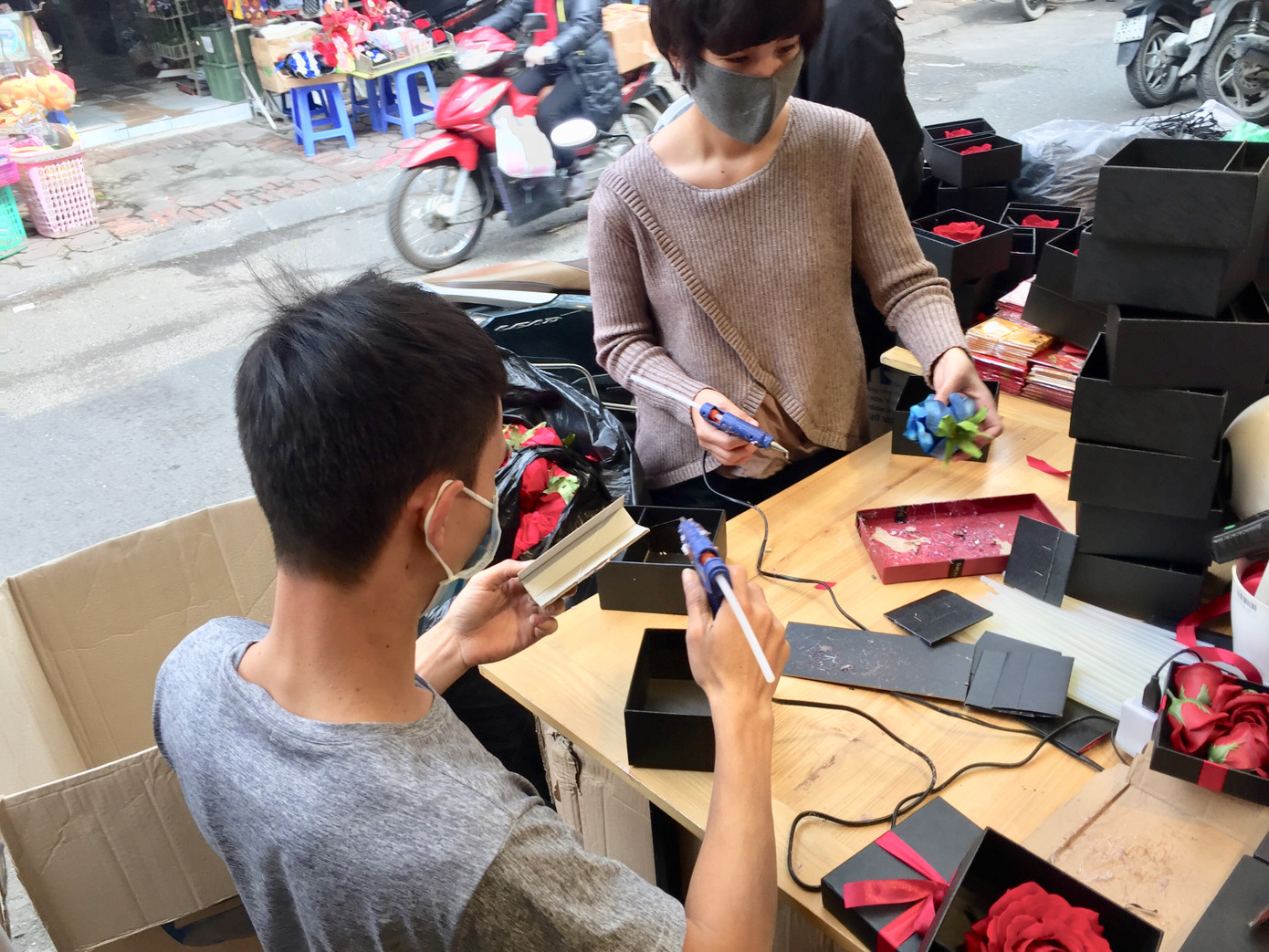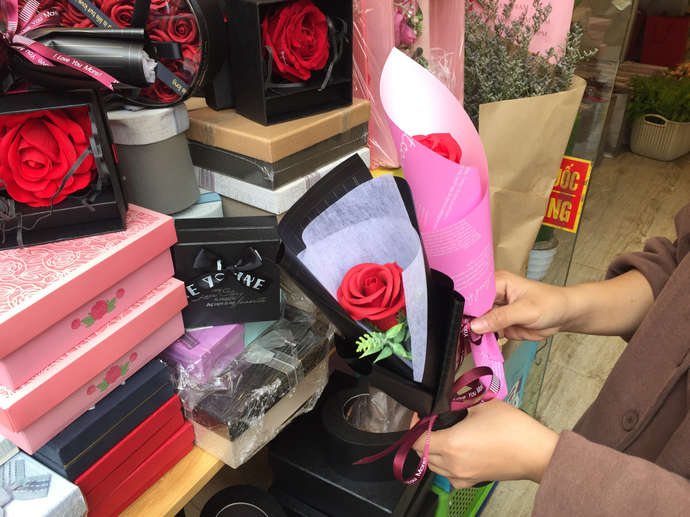 Cách làm đơn giản, từ hộp và hoa chuẩn bị sẵn, chỉ một buổi sáng, cửa hàng chị Tâm (Đống Đa, Hà Nội) có thể cung cấp cả nghìn sản phẩm