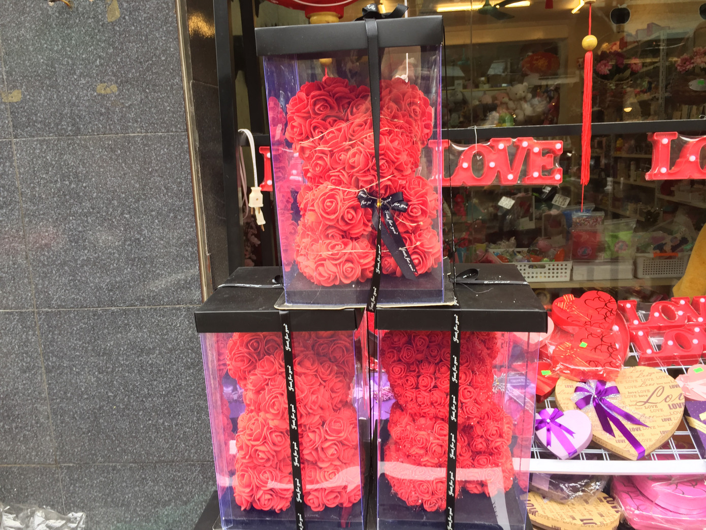 Gấu hoa hồng kích cỡ 20 – 80cm, giá 500.000 – 4 triệu đồng/ hộp. Chị Hà Thu (kinh doanh online) cho biết giá sản phẩm năm nay tăng nhẹ so với năm ngoái do ảnh hưởng từ dịch Corona, nguyên liệu nhập về khó khăn, thêm vào đó, sau kỳ nghỉ Tết, trùng với Valetine nên mọi thứ đắt đỏ, khan hiếm hơn