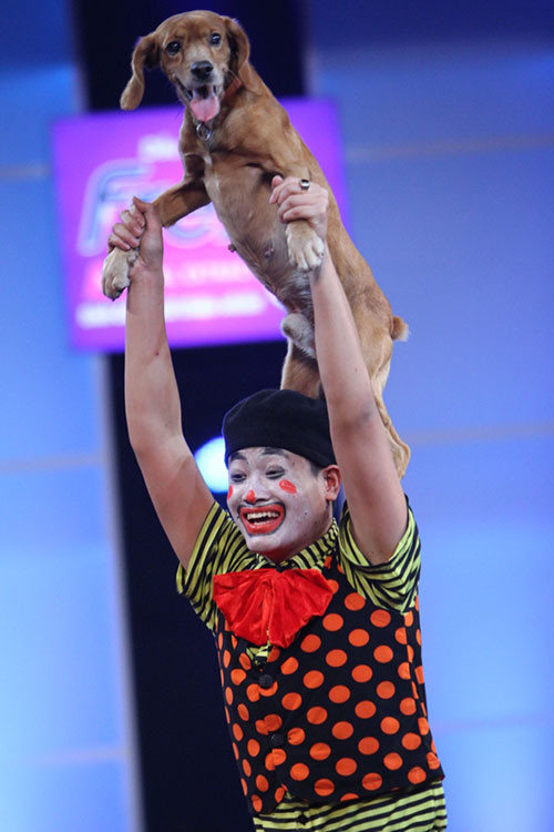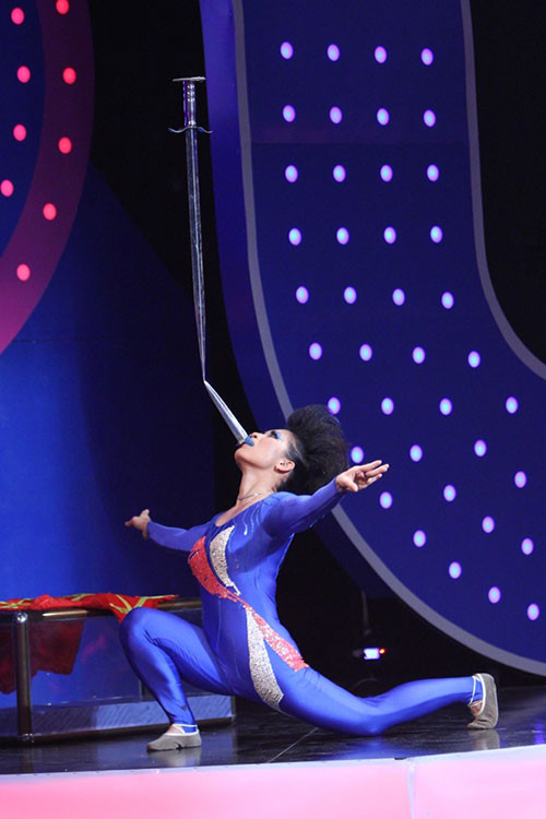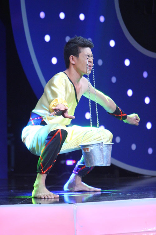 Trong tập 4, các đội chơi và khán giả không khỏi giật mình khi xem màn trình diễn của nghệ sĩ xiếc Hoàng Đặng. Anh dùng mí mắt nâng hai xô nước lên cao.