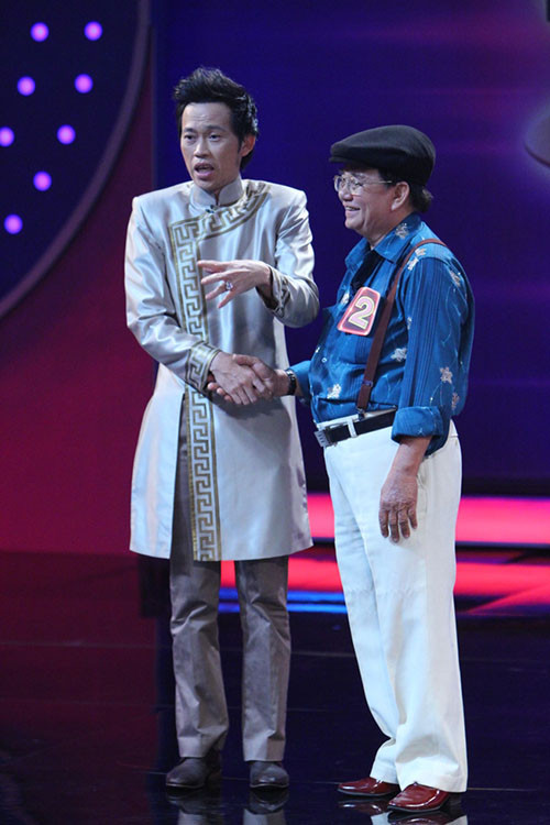 Việt Hương còn trang bị thêm đôi guốc 'khủng' để có chiều cao vượt trội nhằm 'chặt' khách mời Xuân Lan. Việc di chuyển khá khó khăn nên Hoài Linh phải dìu chị ra sân khấu.