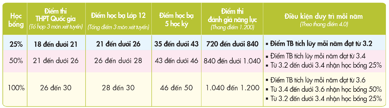 Để khuyến khích tinh thần học tập cho các tân sinh viên trúng tuyển vào UEF với thành tích cao, hàng năm, Nhà trường đều dành tặng nhiều suất học bổng cho sinh viên. Trong đó, với phương thức xét tuyển học bạ, thí sinh vẫn có thể nhận được suất học bổng giá trị từ 100%, 50%, 25% học phí. Đặc biệt, đây là các suất học bổng không giới hạn số lượng và áp dụng cho tất cả sinh viên UEF trúng tuyển ở tất cả các ngành.