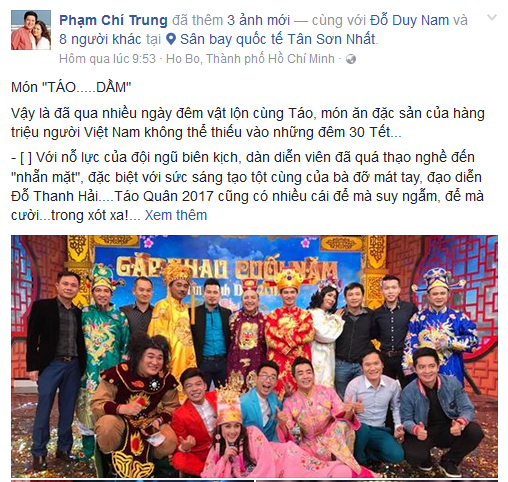 Chương trình Táo quân 2017 đã chính thức đóng máy sau 3 đêm diễn 16-17-18/1. Trên trang cá nhân, nghệ sĩ Chí Trung đã có những dòng chia sẻ về chương trình giải trí được mong đợi nhất dịp Tết này.