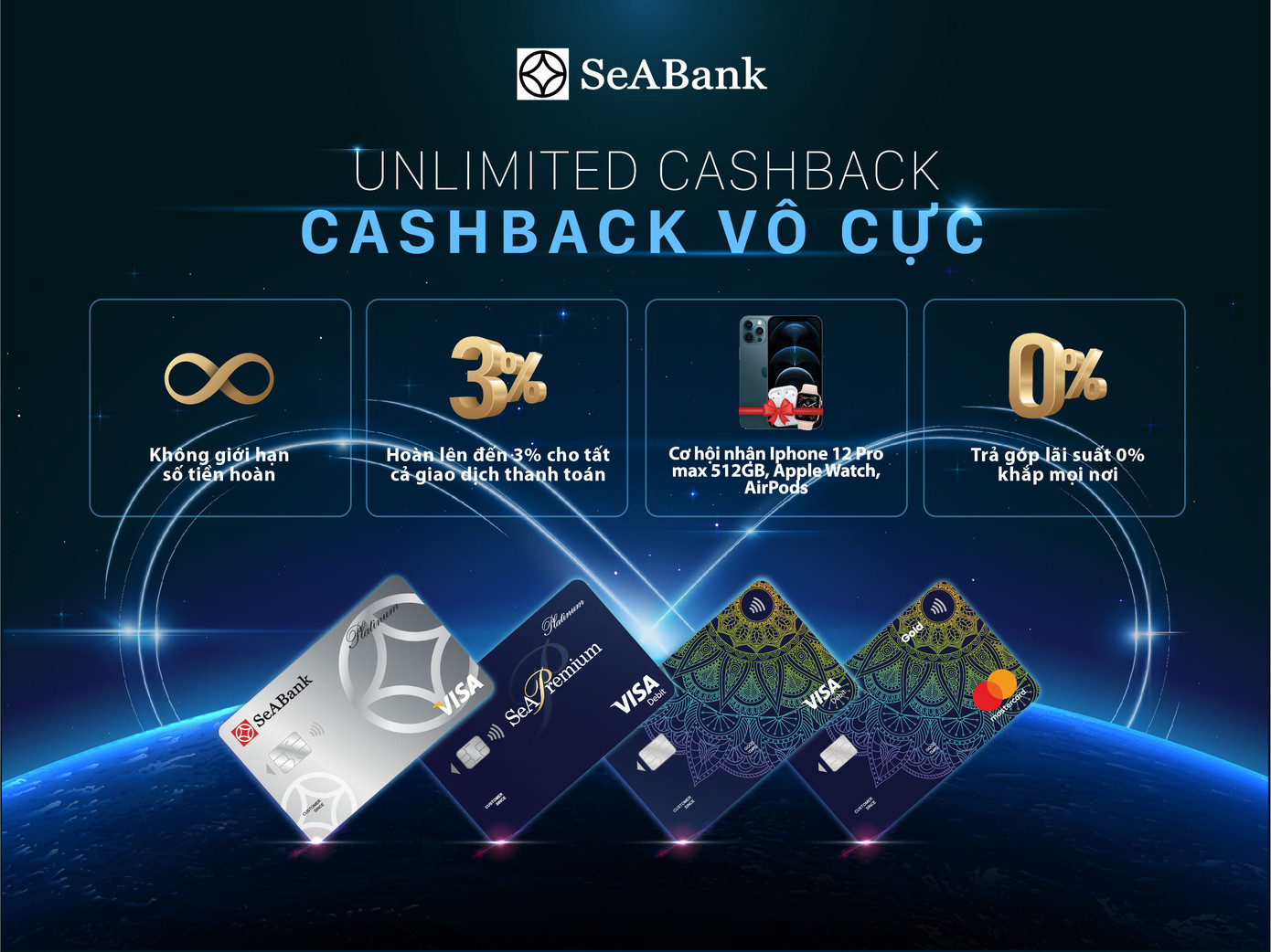 Ngân hàng TMCP Đông Nam Á (SeABank) triển khai chương trình ưu đãi hoàn tiền không giới hạn - “Cashback vô cực” dành riêng cho chủ thẻ tín dụng Visa Platinum và hoàn tiền lên đến 500.000 đồng dành cho chủ sở hữu các sản phẩm thẻ ghi nợ Visa SeAPremium, thẻ ghi nợ Visa/MasterCard hạng Gold với mức hoàn tiền lên tới 3% giá trị tất cả các giao dịch thanh toán.
