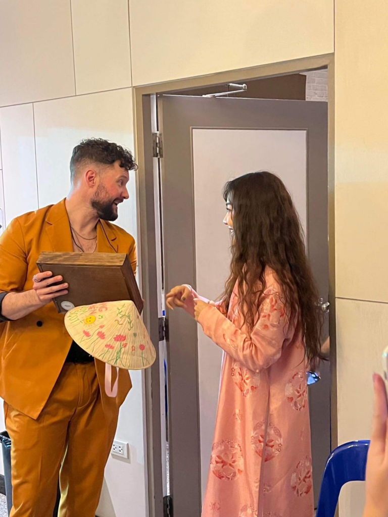 Khoảnh khắc Calum Scott hạnh phúc nhận quà và đội chiếc nón lá đã khiến khán giả tham gia concert thích thú. Không ít người hâm mộ đã hét lớn để cổ vũ cho Hoàng Duyên.