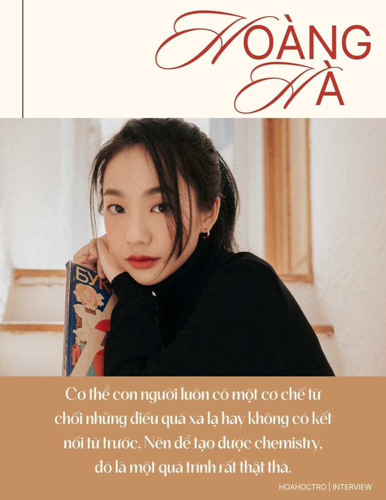Hoàng Hà chia sẻ, cô và các bạn diễn đều cần những điểm chạm ban đầu dù sự gượng gạo là điều không tránh khỏi. Khi những điểm chạm đó được lặp lại vừa đủ, mọi thứ tự động trở nên thân thuộc, tự nhiên hơn. Từ đó, "phản ứng hóa học" sẽ xảy ra.