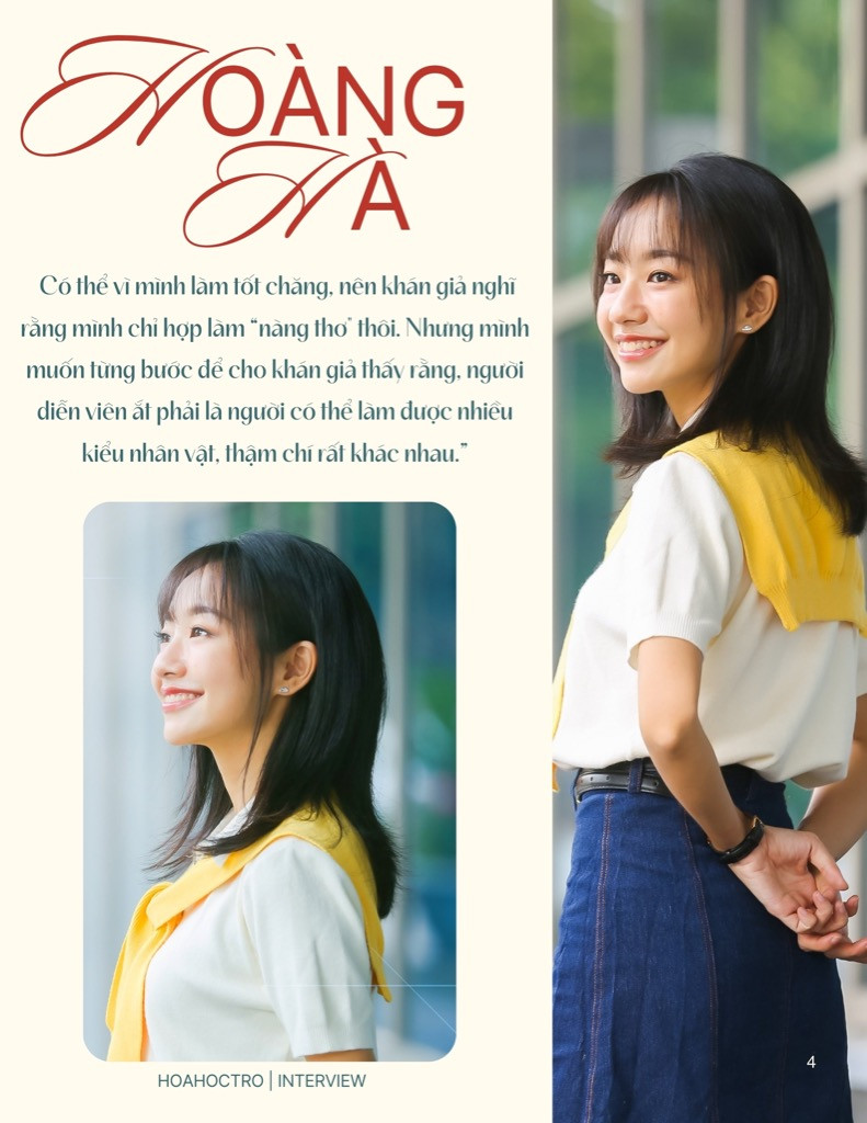 “Hà không còn ở tuổi 18, đôi mươi nên khi đóng vai ở độ tuổi đó, mình sẽ đưa lại sự trong trẻo của tuổi trẻ để tạo nên nhân vật, phủ lên cơ thể và gương mặt mình. Đôi khi có thể vì mình làm tốt chăng, nên khán giả lại nghĩ rằng mình chỉ hợp làm 'nàng thơ' thôi. Nhưng mình muốn từng bước để cho khán giả thấy rằng, người diễn viên ắt phải là một người có thể làm được nhiều kiểu nhân vật, thậm chí là rất khác nhau.” - Hoàng Hà nhấn mạnh.