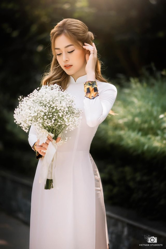 Á hậu Phương Nga dịu dàng, xinh đẹp với áo dài trong bộ ảnh kỷ yếu.