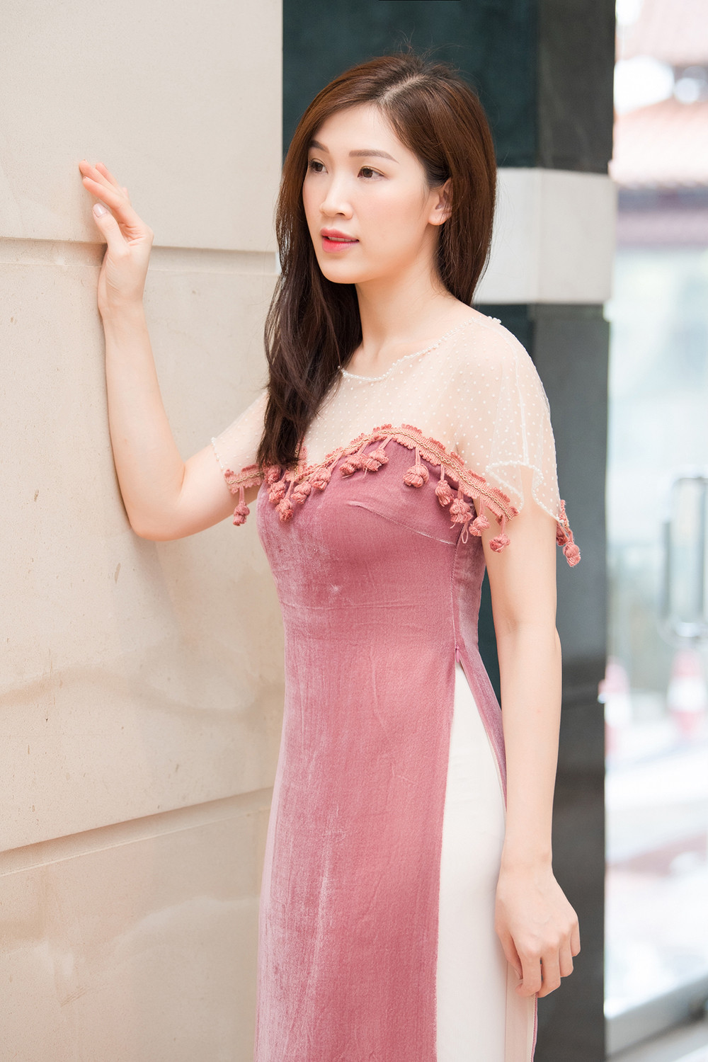 Hoa hậu Áo dài Phí Thuỳ Linh dịu dàng với áo dài màu hồng phấn.