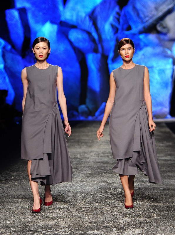 Bộ sưu tập mở màn show thu đông 2014 của Đỗ Mạnh Cường có gam màu xám - hồng pastel làm chủ đạo. Các thiết kế theo phong cách tối giản, chú trọng kiểu dáng dành cho mùa lạnh và ứng dụng ở đời thường. Trong ảnh là cặp người mẫu mở màn show diễn là Lê Thúy và Thanh Thảo. Bộ đôi diện trang phục tông màu xám, cùng khăn lông giống nhau, tự tin sải bước.