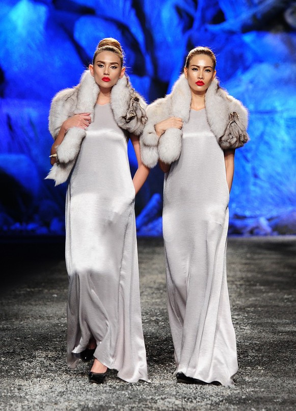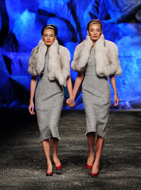 Để phù hợp với chủ đề bộ sưu tập thu đông 2014 - The Twins, các người mẫu của show Đỗ Mạnh Cường được ghép đôi, trình diễn các thiết kế mới trên đường băng đầy cảm hứng mô phỏng dãy núi và con đường, diễn ra vào tối 25/11 tại TP.HCM. Trên sàn catwalk sáng tạo, Hoàng Thùy bắt cặp cùng đàn em Hằng Nguyễn, cùng diện trang phục giống nhau thể hiện tốt ý tưởng BST Sinh đôi.