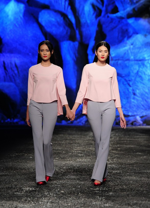 Phùng Ngọc Yến và Quanh Đi sành diệu với hai tông màu xám hồng, chủ đạo của show diễn. Cả hai không chỉ diện trang phục đồng màu, tông trang điểm và kiểu tóc cũng giống y đúc.
