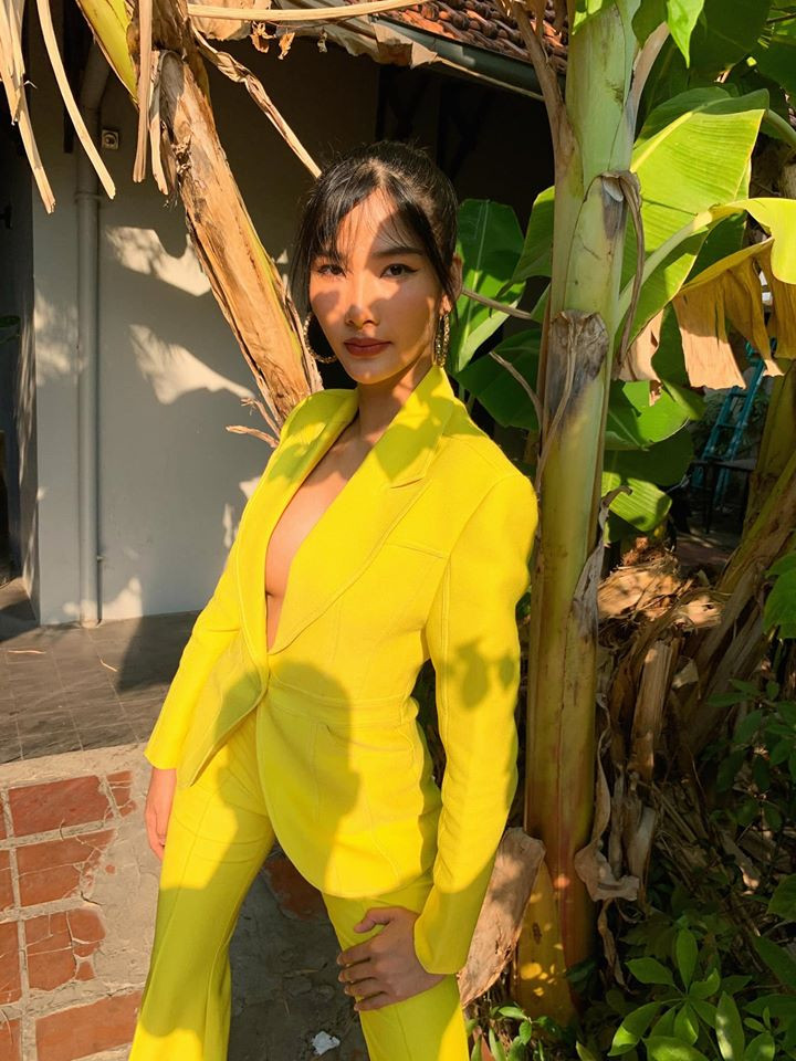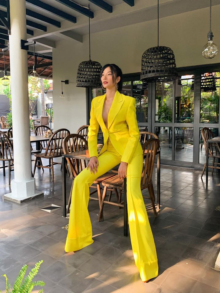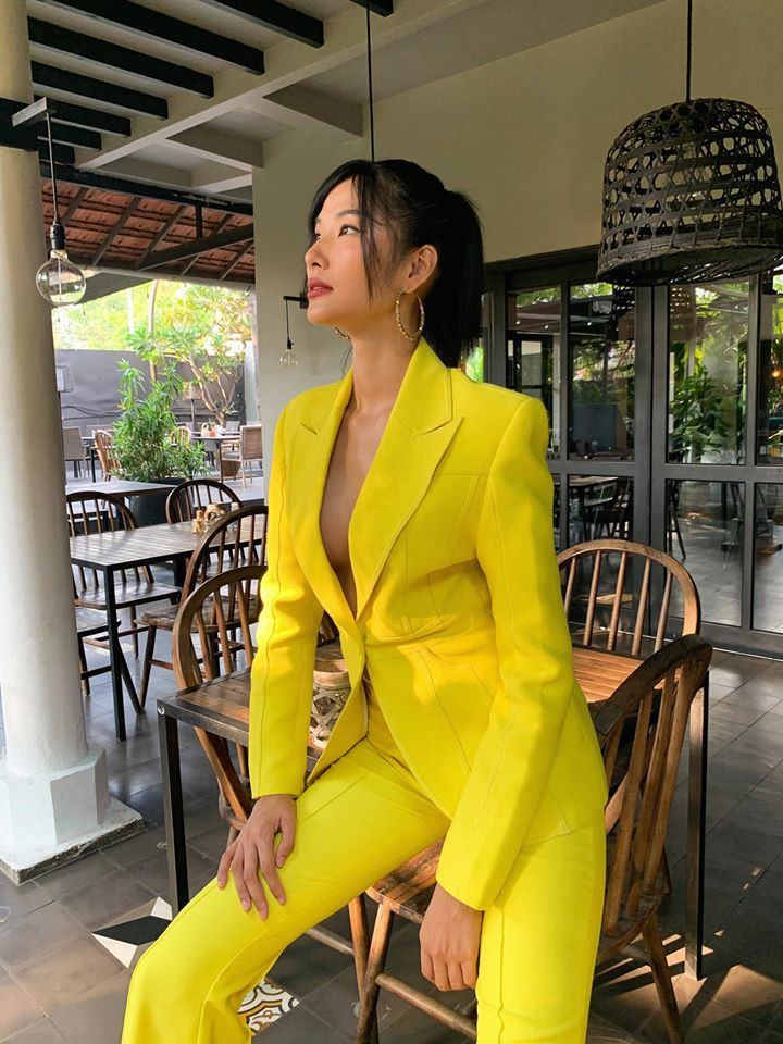Á hậu Hoàn vũ Việt Nam 2017 diện 'cây vest' màu vàng rực vô cùng nổi bật dưới nắng hè.
